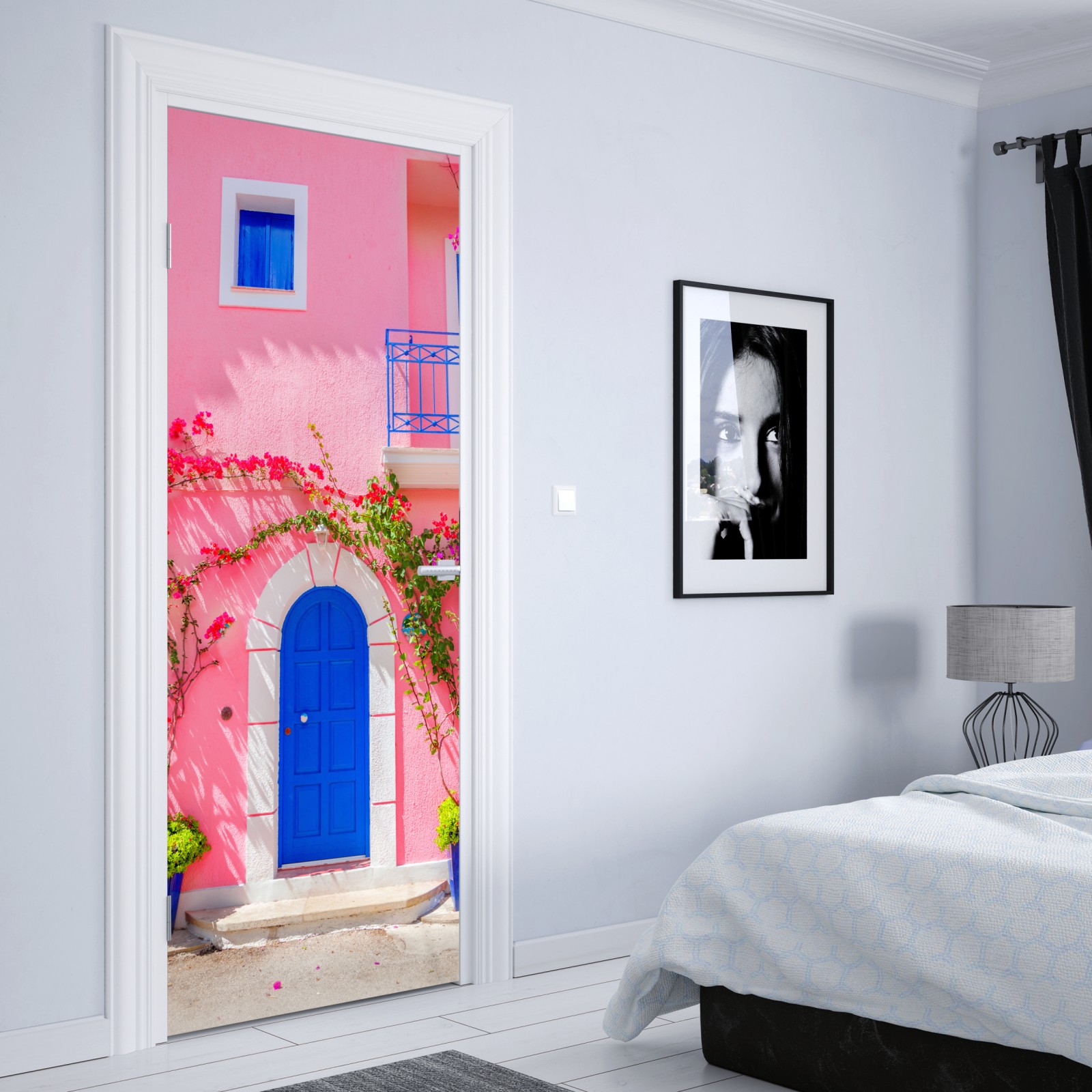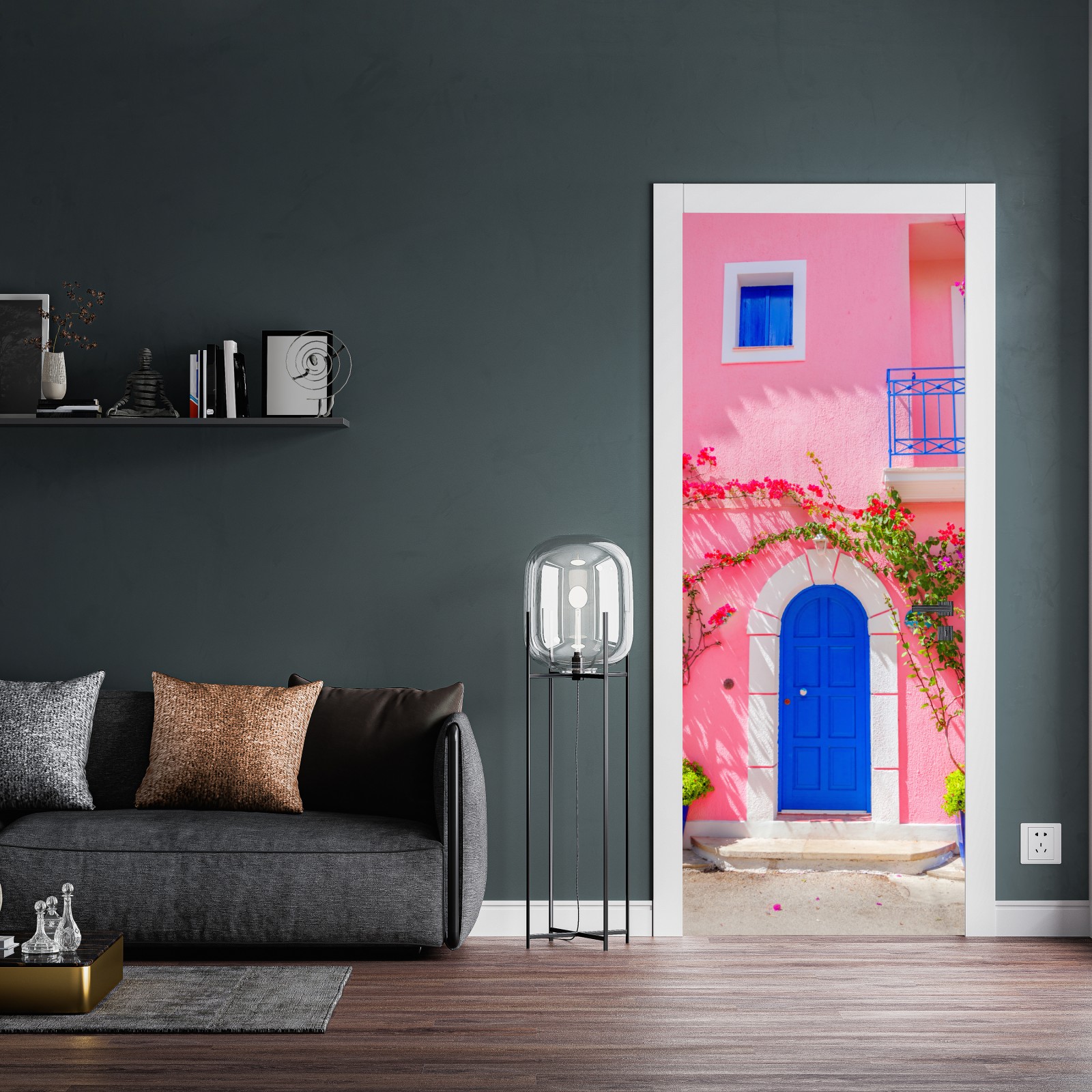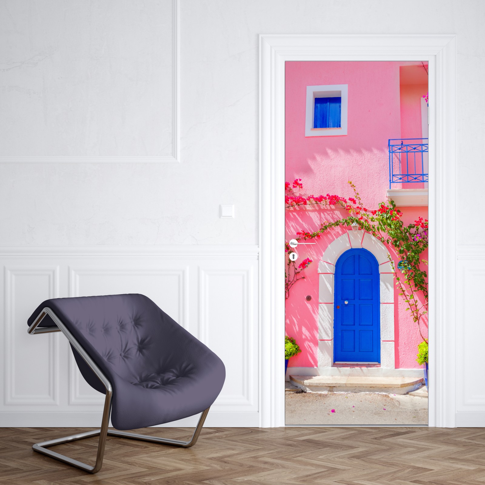 Naklejka na drzwi Intensywna różowa fasada z niebieskimi drzwiami
