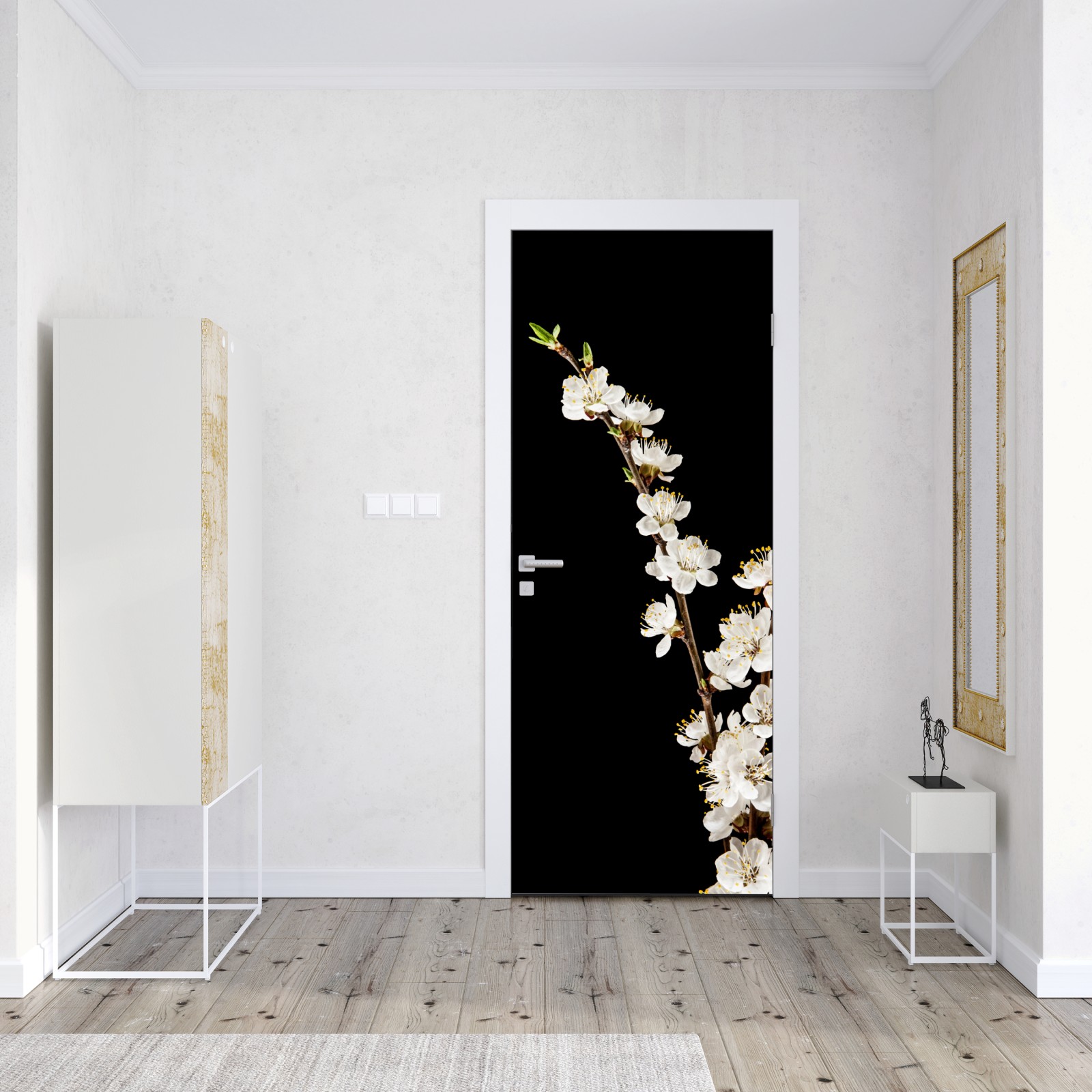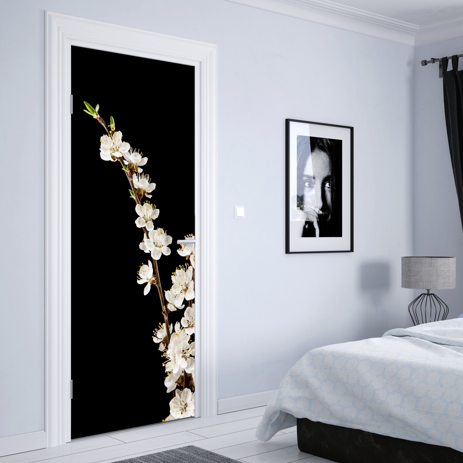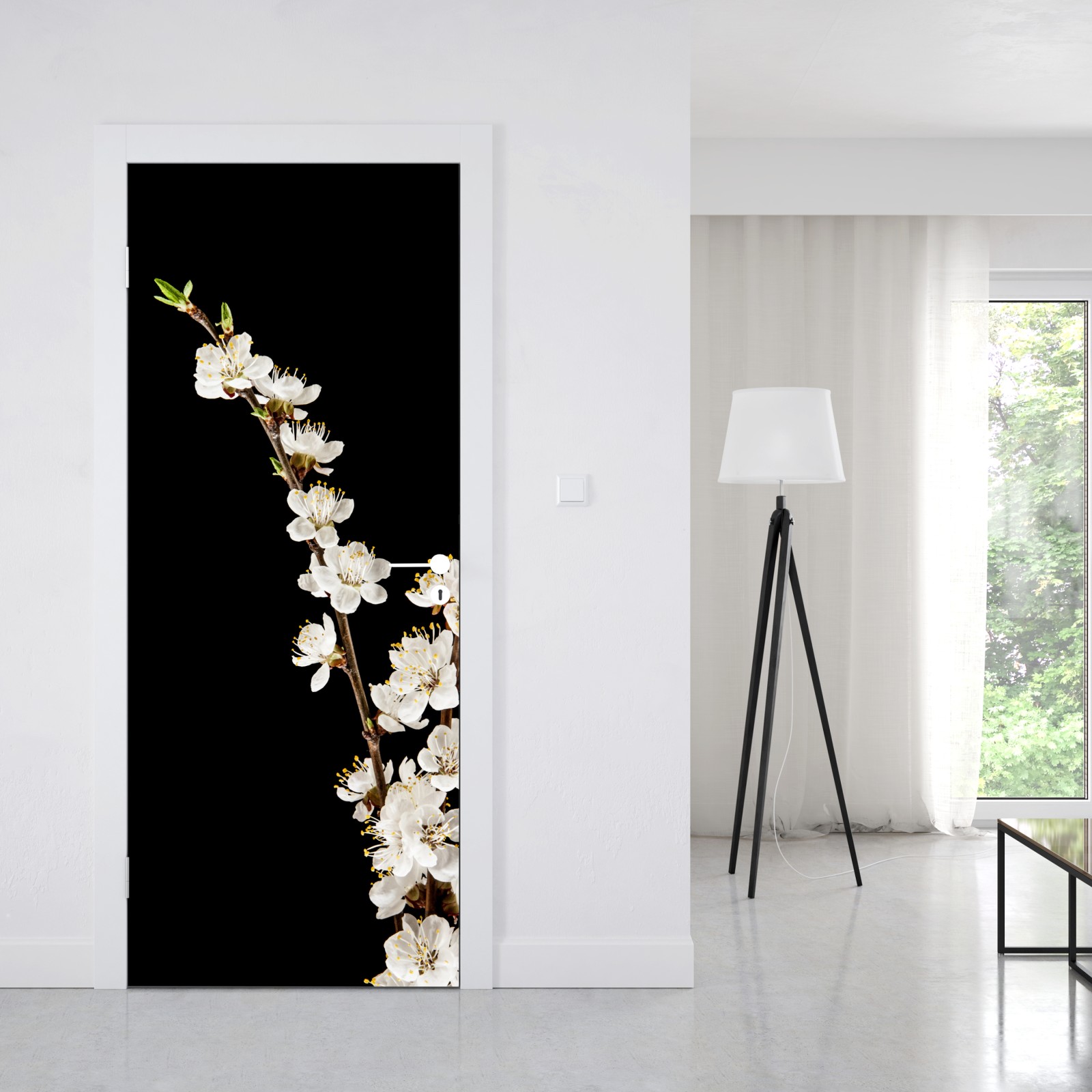 Naklejka na drzwi Delikatna gałązka kwitnącej moreli na czarnym tle