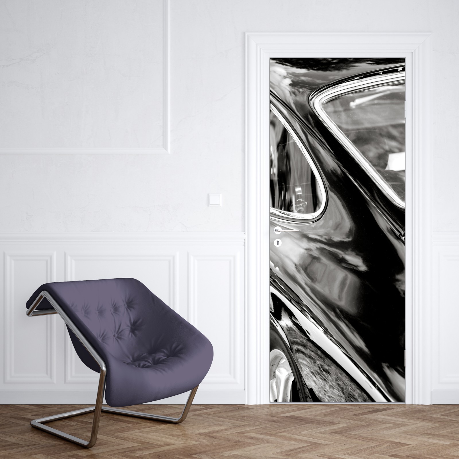 Podkreślający elegancję klasycznego auta, czarno-biały detal ukazujący błyszczące refleksy i gładkie linie.