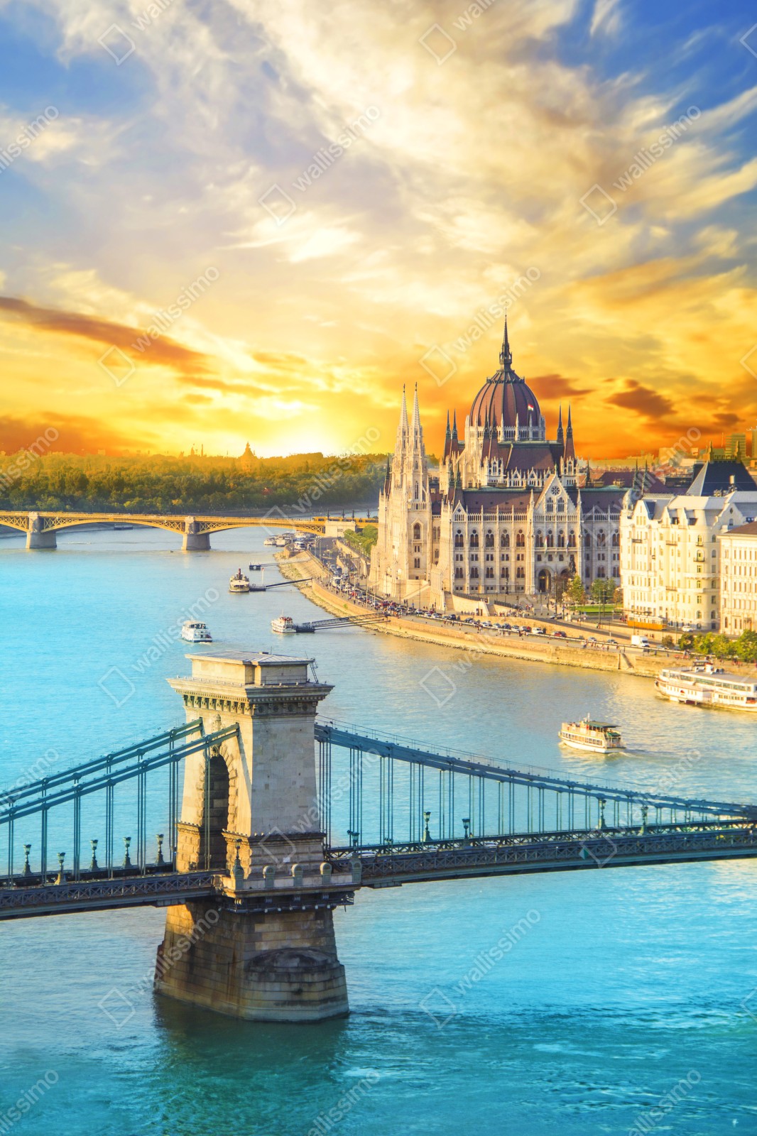 Poczuj złotą atmosferę wieczornego Budapesztu na tej barwnej panoramie z mostem łańcuchowym.