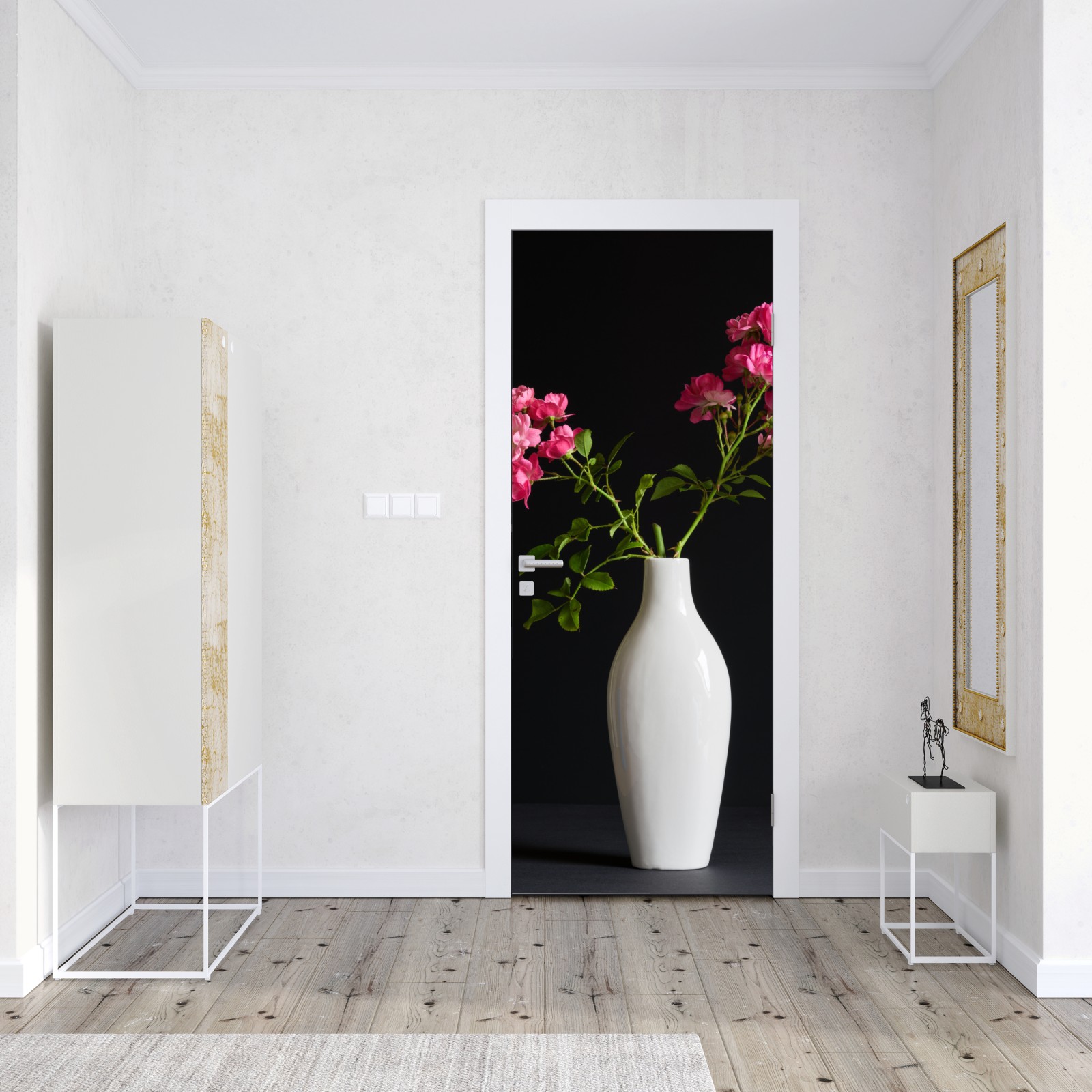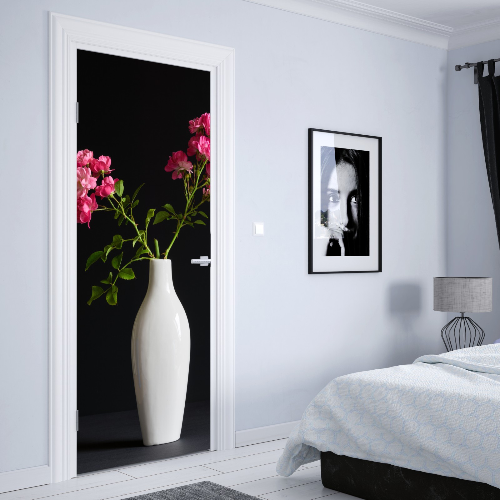 Dodaj subtelnej elegancji do wnętrza dzięki minimalistycznej kompozycji róż w białej wazie na czarnym tle.