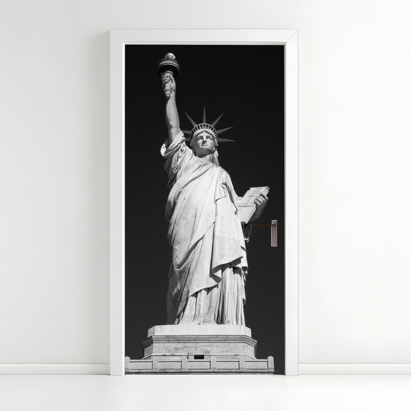 Stwórz dramatyczny plakat w odcieniach szarości z ikoną Statua Wolności na głębokim czarnym tle dla wyrazistego kontrastu.