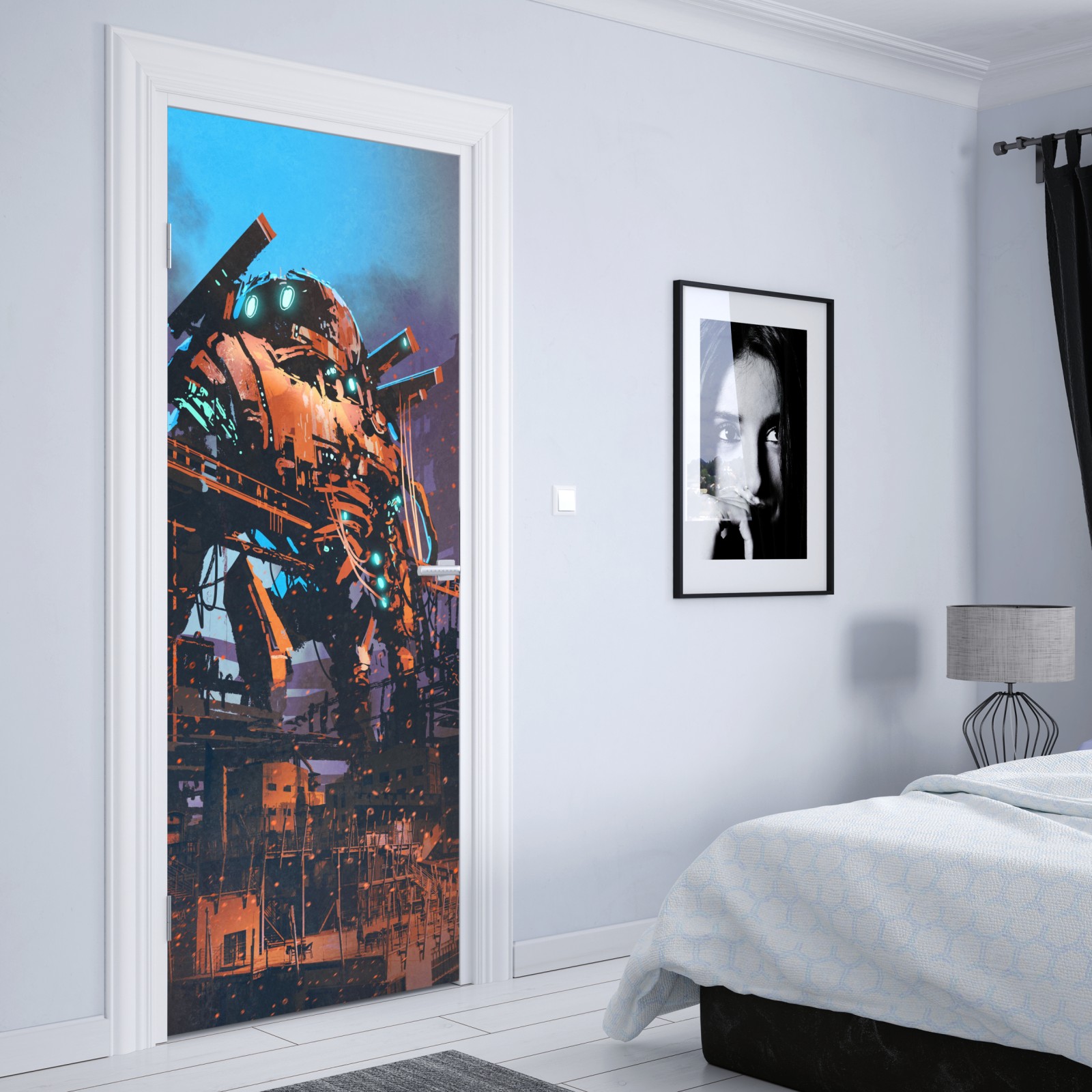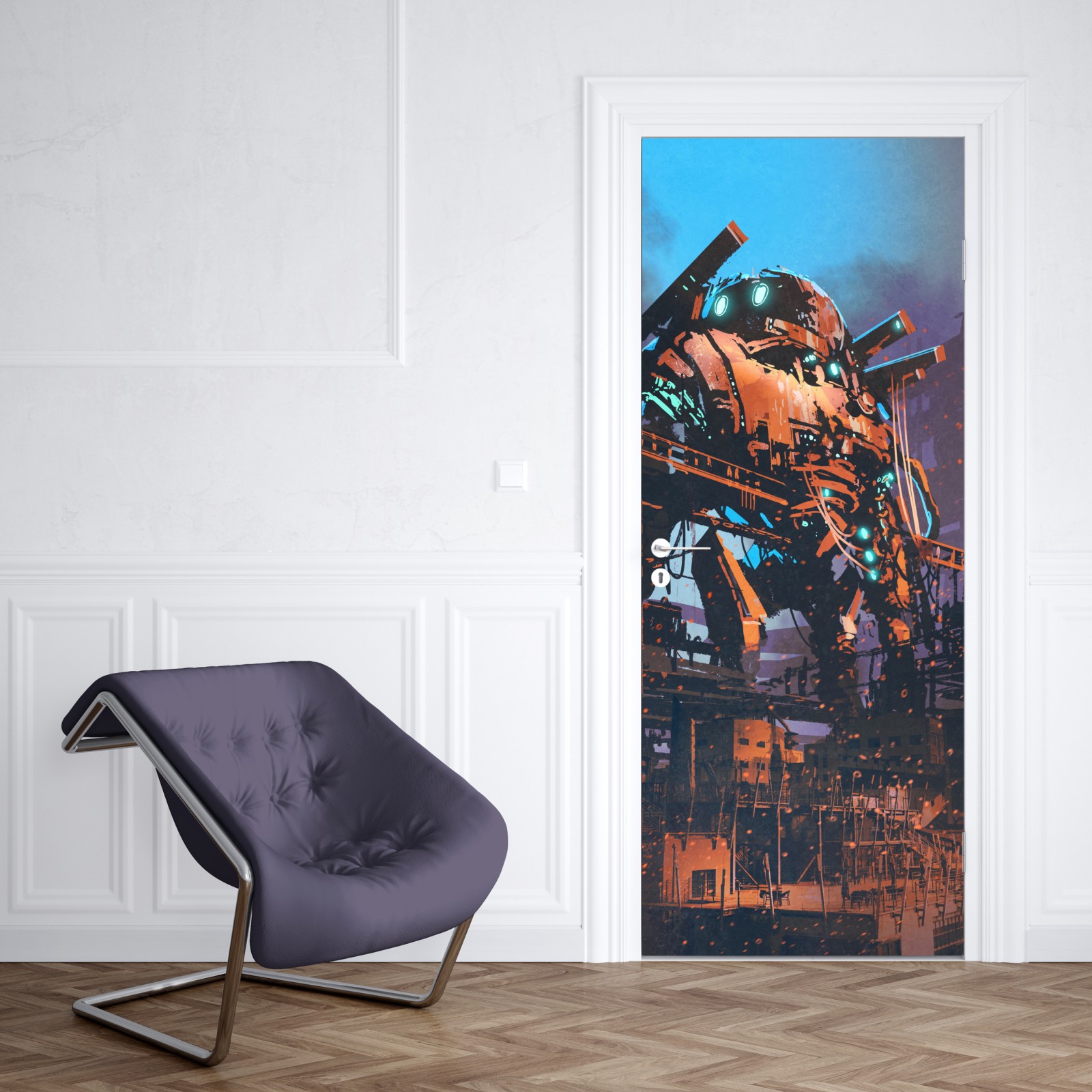 Dodaj industrialnego, science fiction charakteru do wnętrza dzięki ilustracji przedstawiającej ogromnego mecha w opuszczonej fabryce.