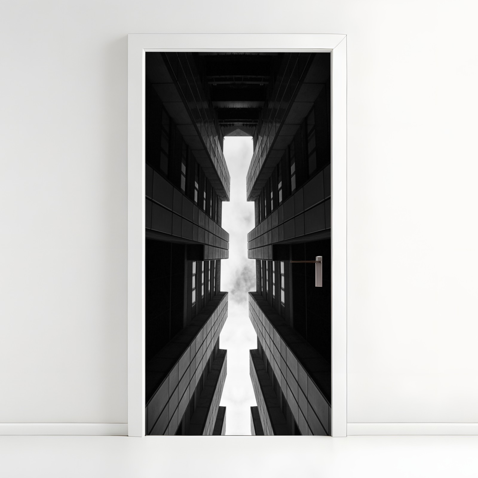 Naklejka na drzwi Pionowa miejska symetria w monochromie