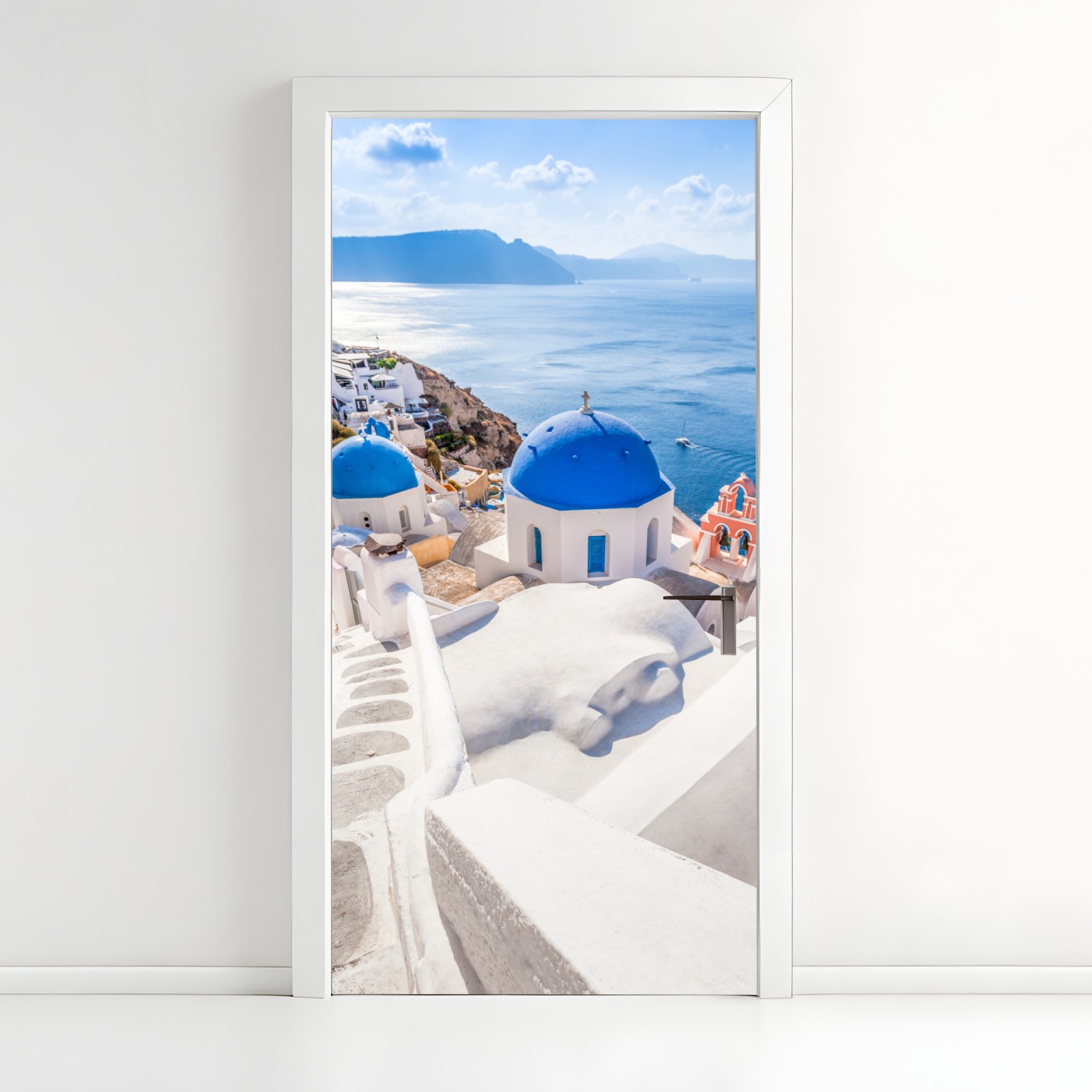 Naklejka na drzwi Słoneczne Santorini niebieskie kopuły i widok na morze