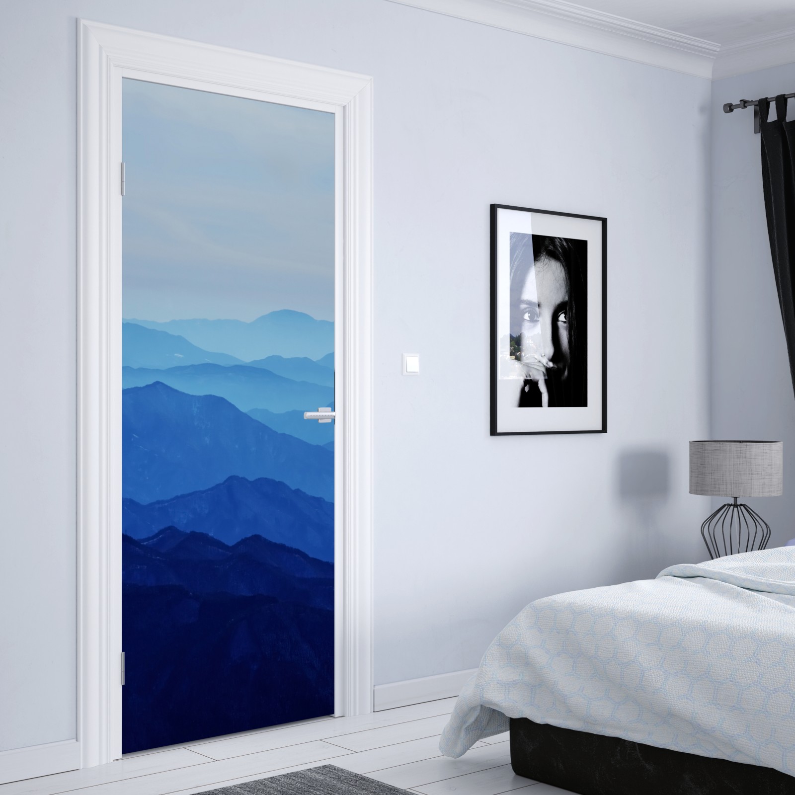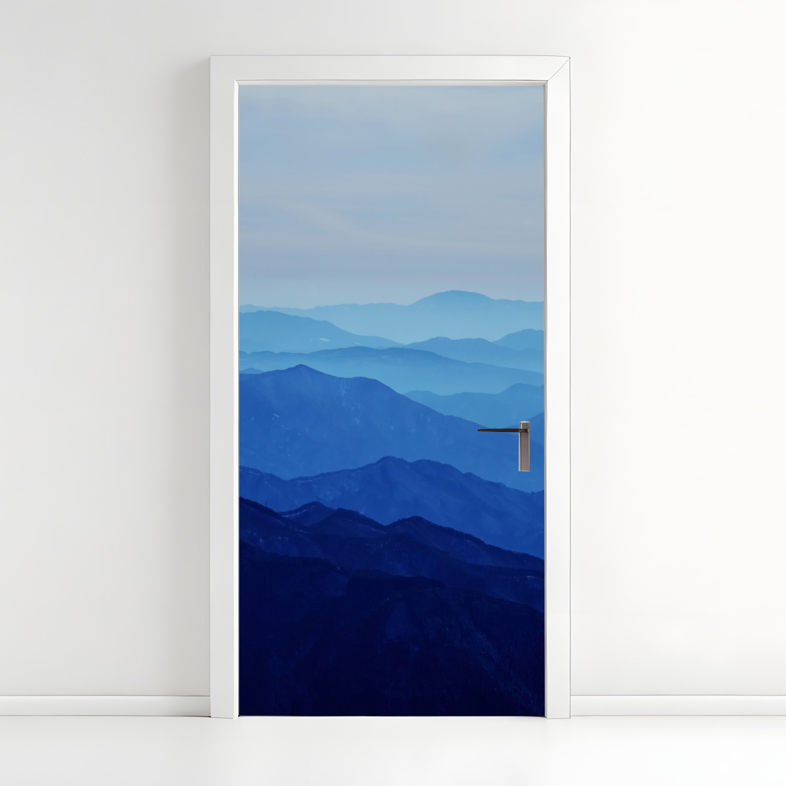 Wprowadź spokój do wnętrza dzięki tej mglistej niebieskiej panoramie gór z warstwowymi szczytami i delikatną atmosferą.