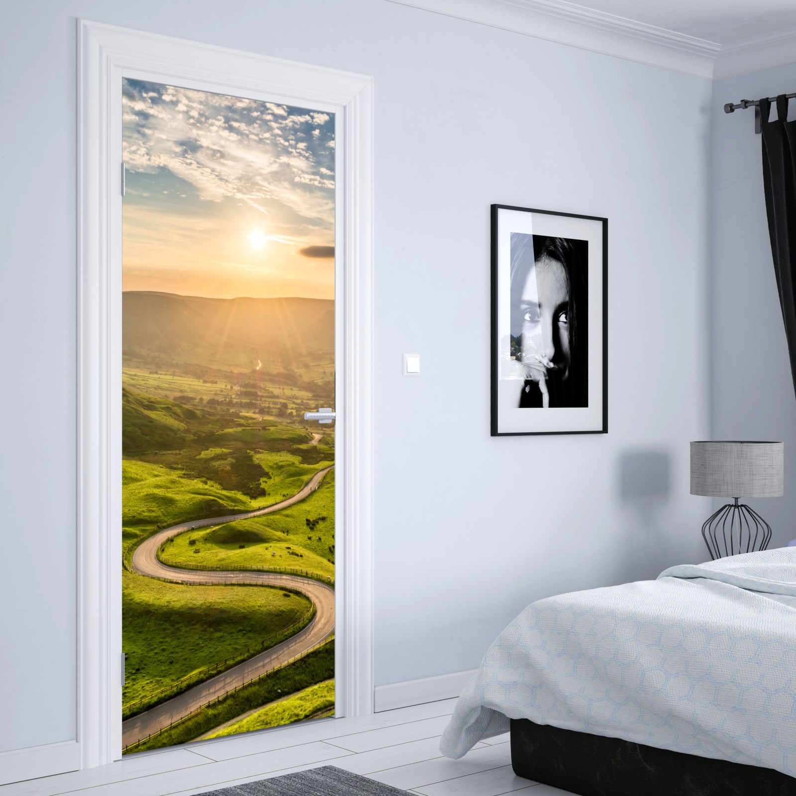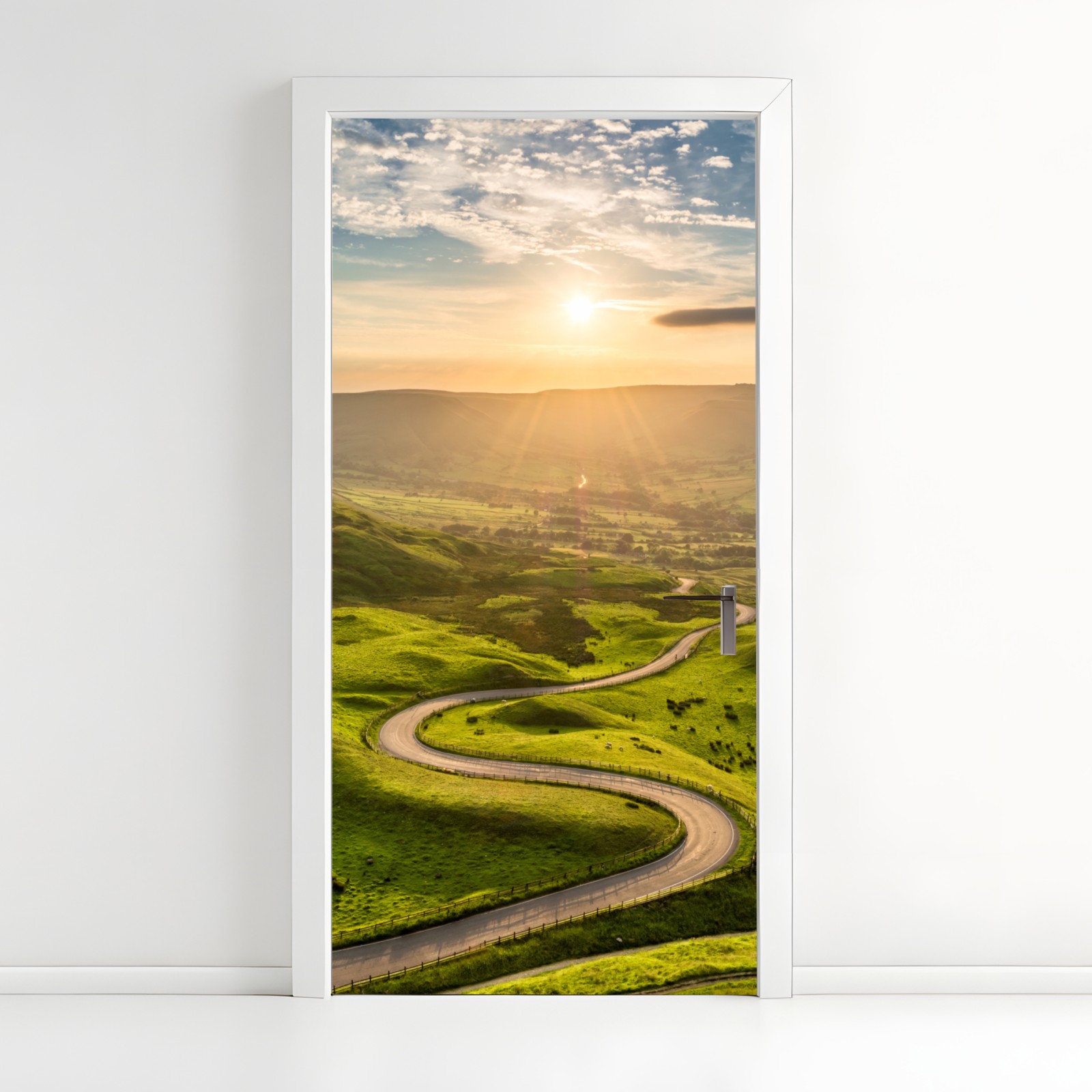 Wprowadź spokój wiejskiego krajobrazu do wnętrza dzięki temu słonecznemu widokowi na krętą drogę wśród zielonych łąk.