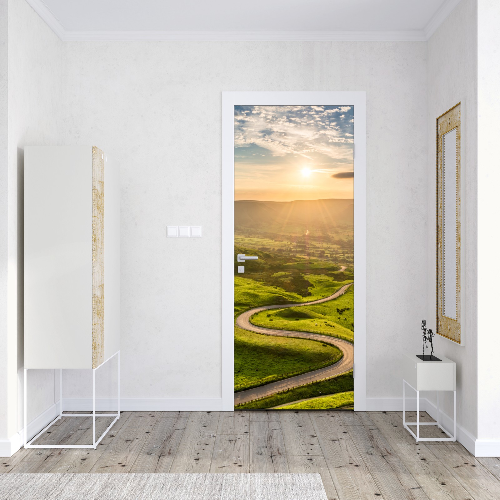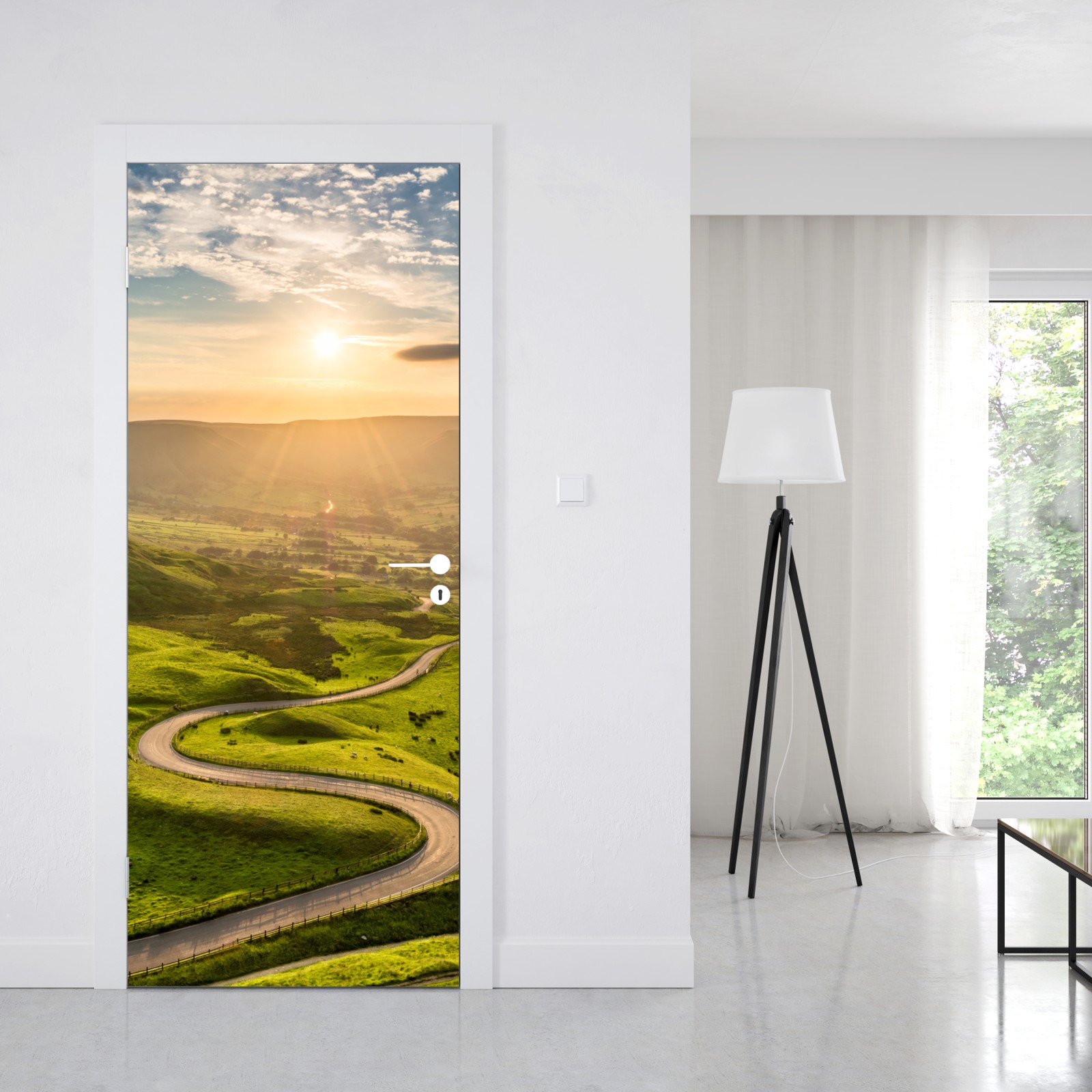 Naklejka na drzwi Złoty zachód słońca nad krętą wiejską drogą