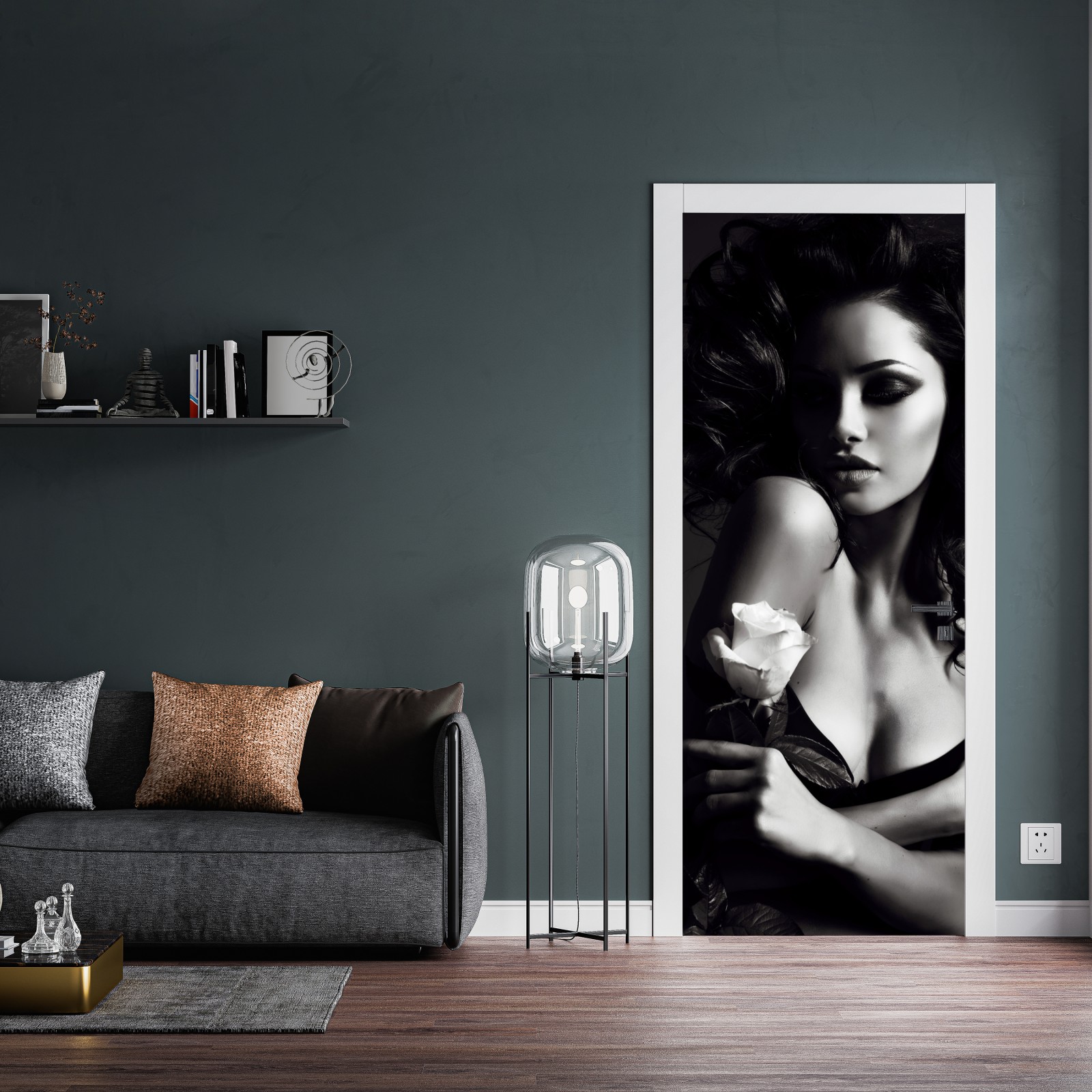 Naklejka na drzwi Zmysłowy czarno-biały portret z różą