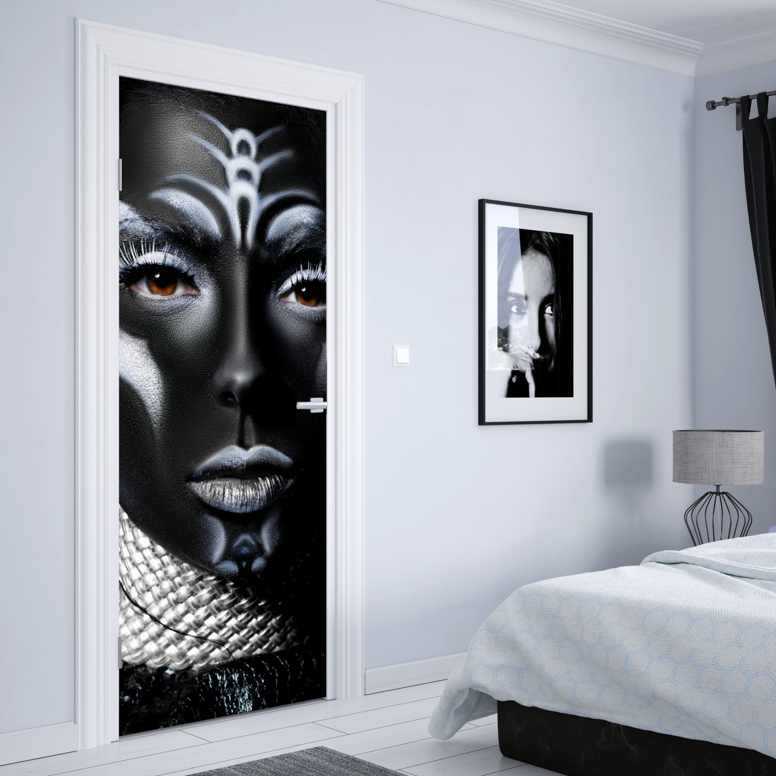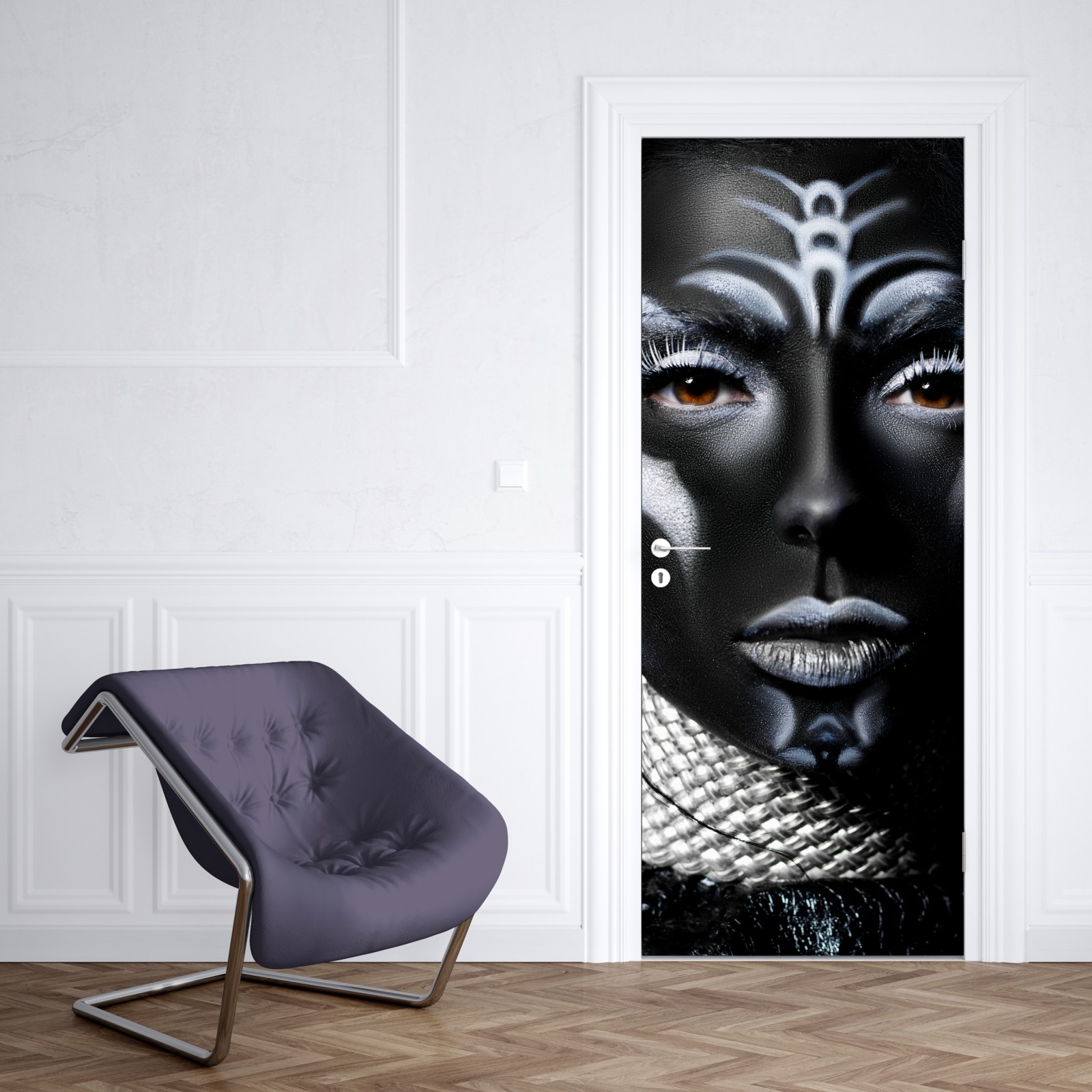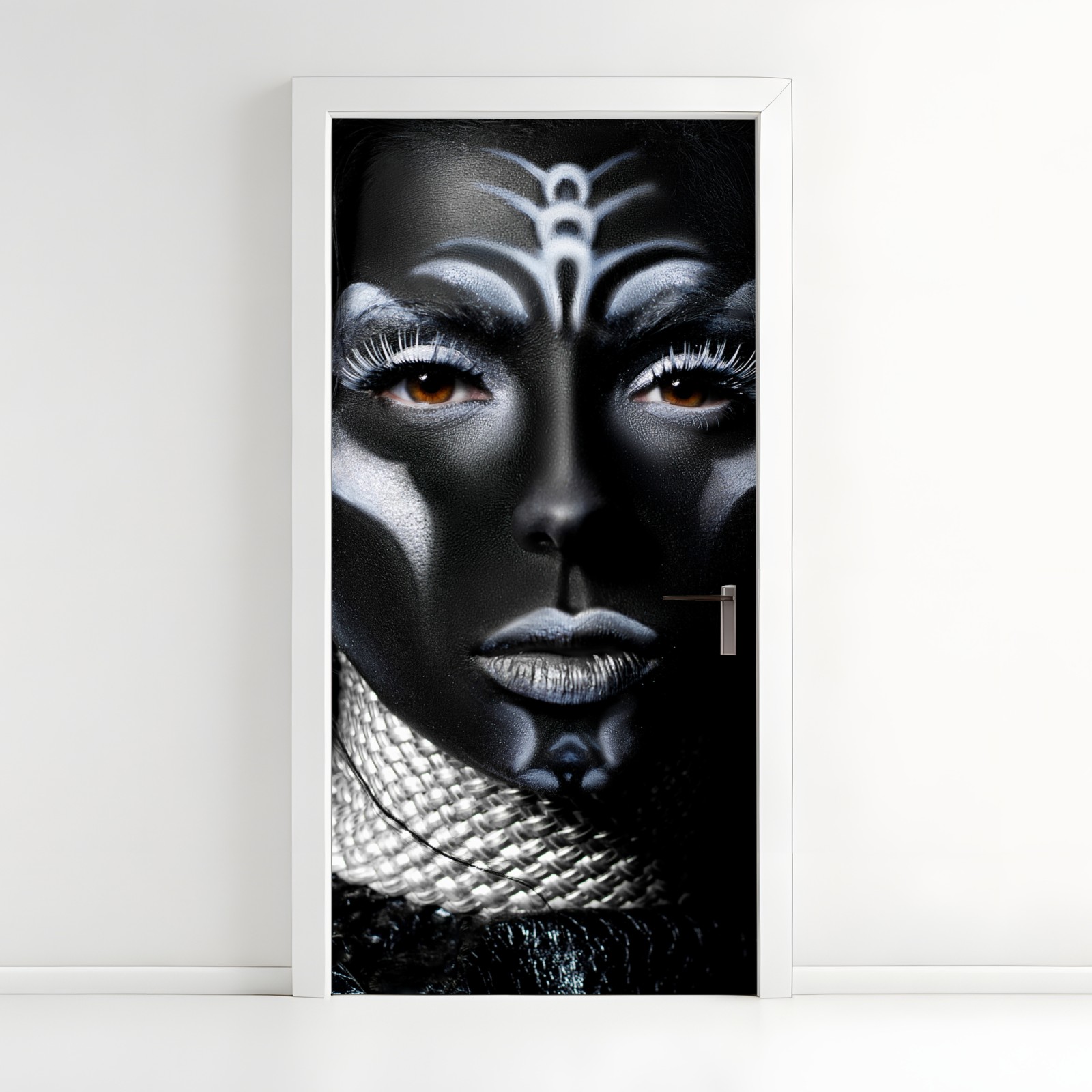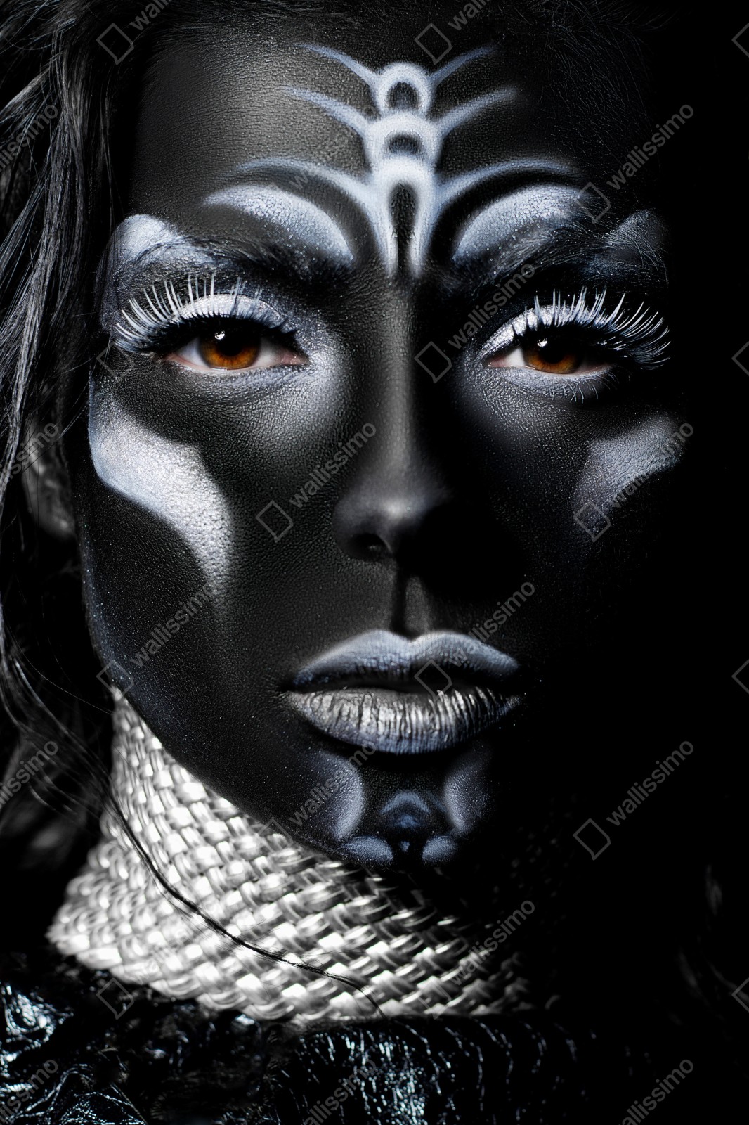 Wyrazisty zbliżeniowy portret z dramatycznym czarnym malowaniem ciała i kontrastującymi białymi detalami, idealny do nowoczesnych wnętrz.