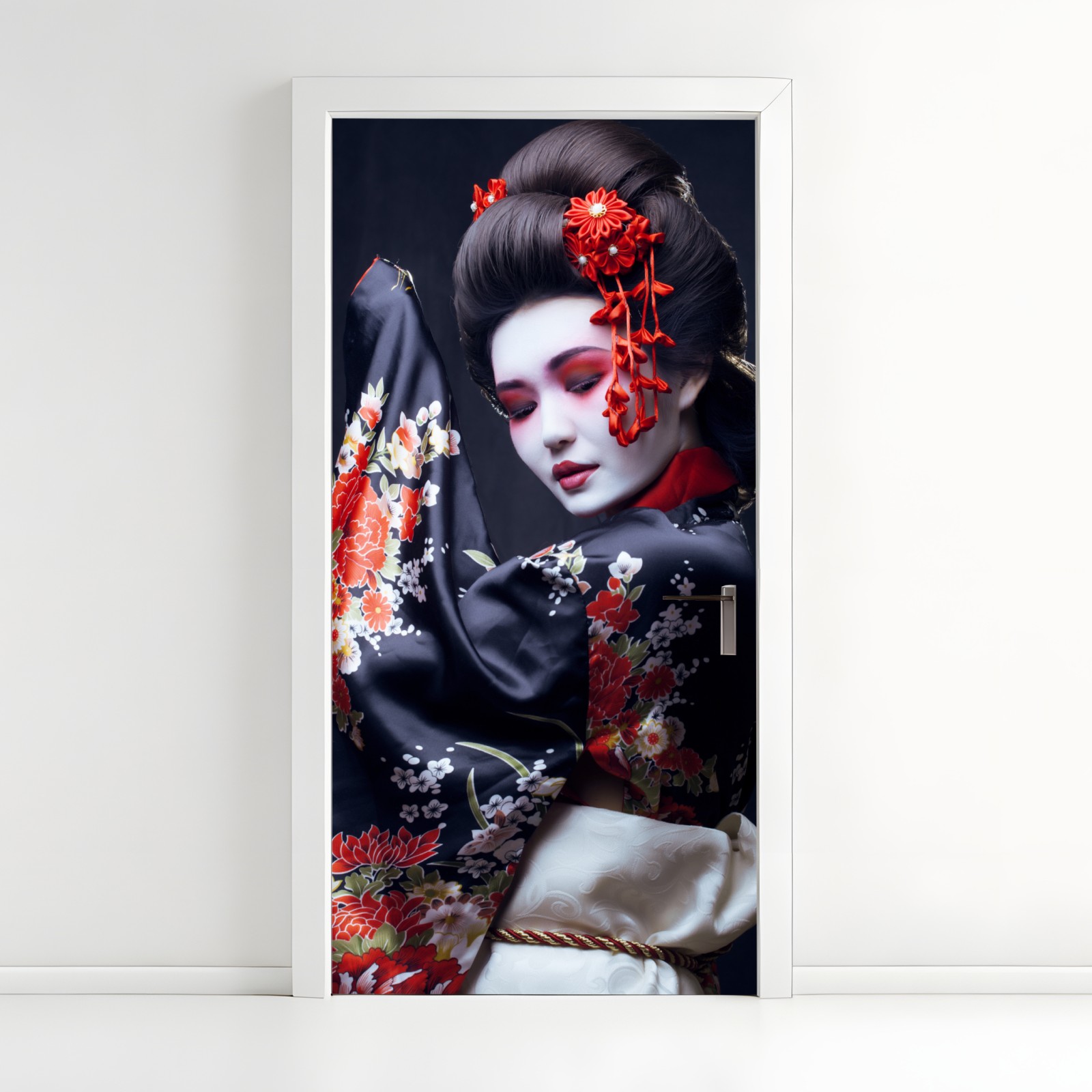 Naklejka na drzwi Elegancki portret gejszy w czerwonym i czarnym kimonie