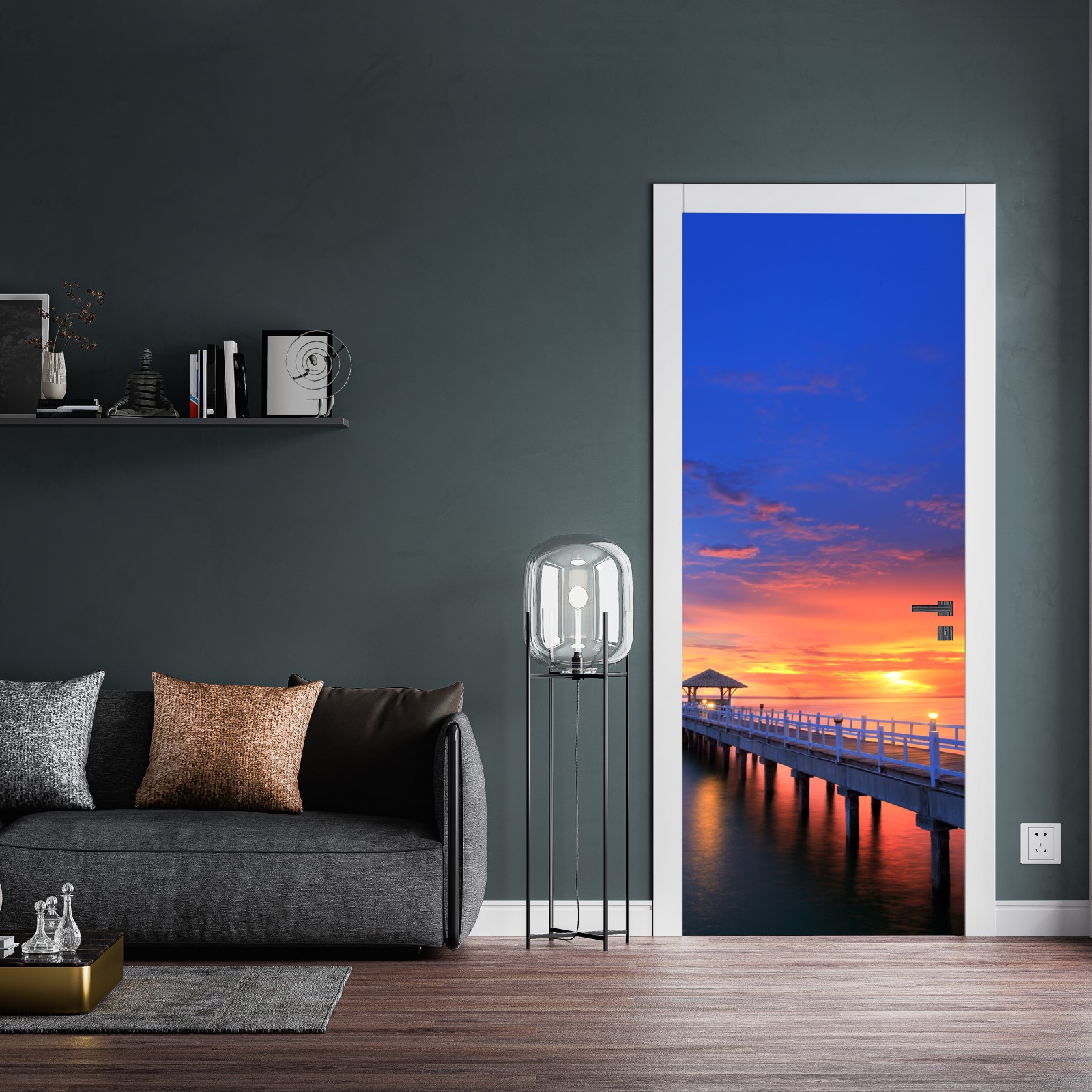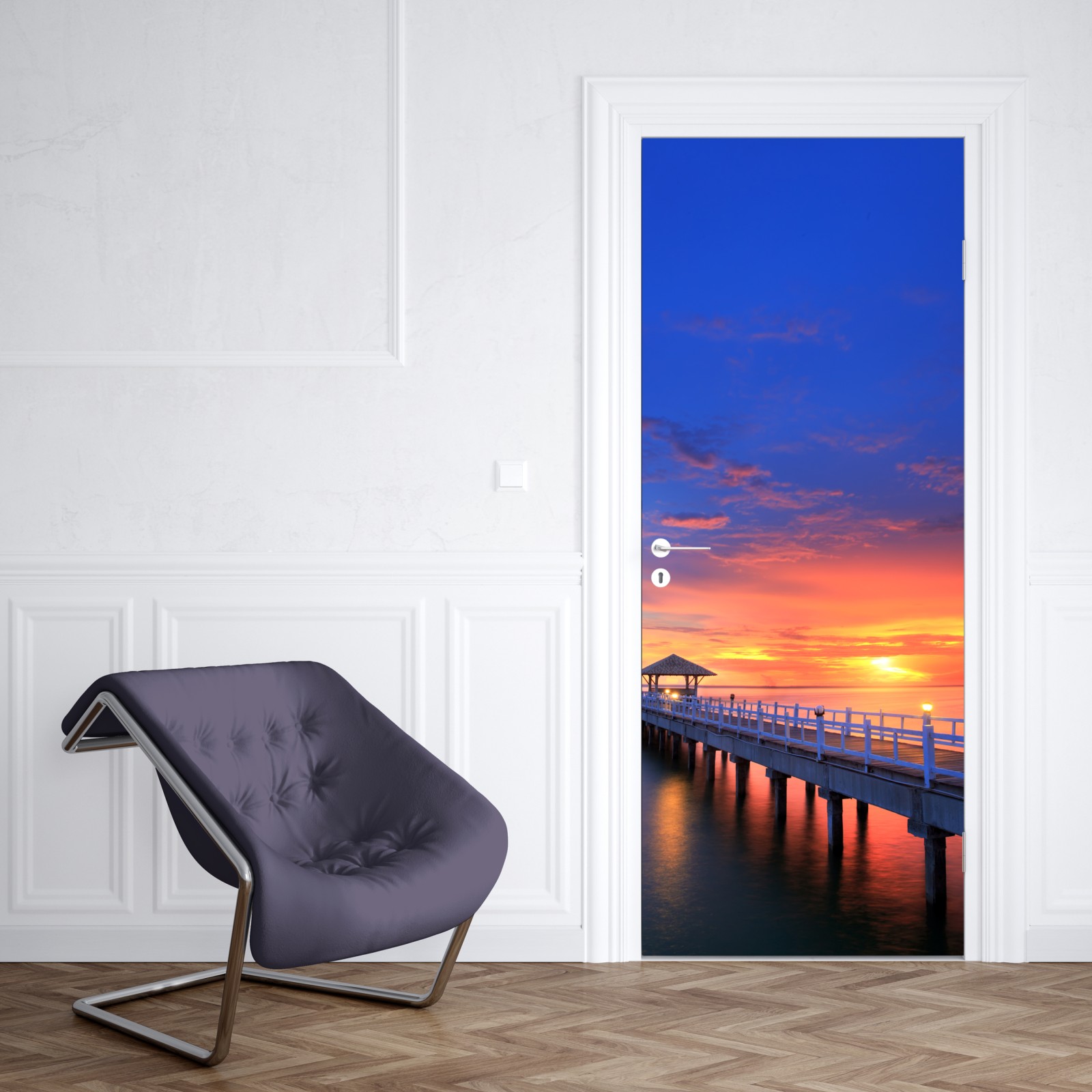Wprowadź spokojną nadmorską atmosferę do wnętrza dzięki intensywnemu zachodowi słońca nad drewnianym molem.