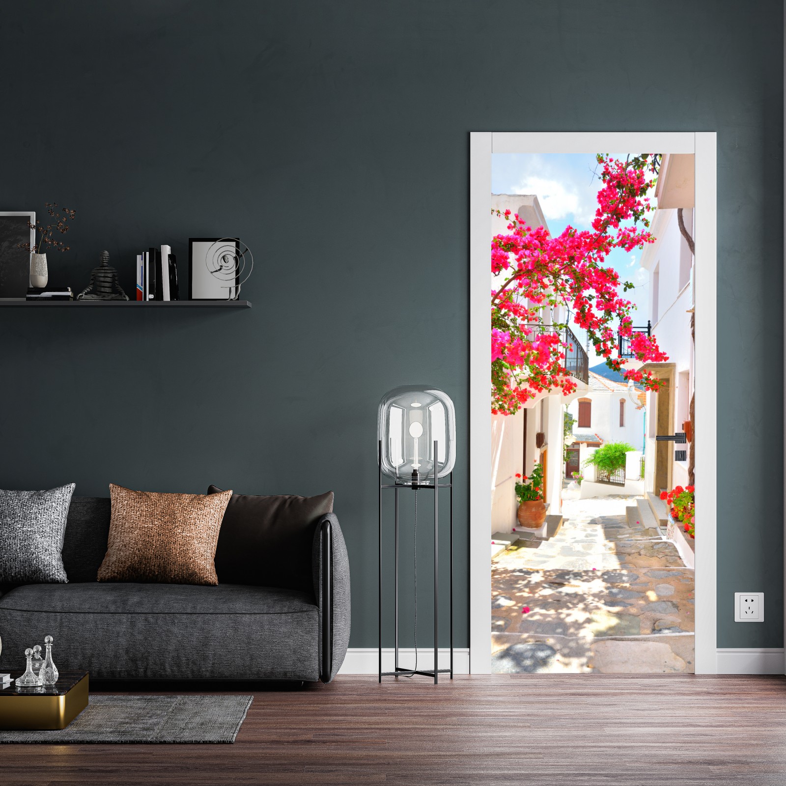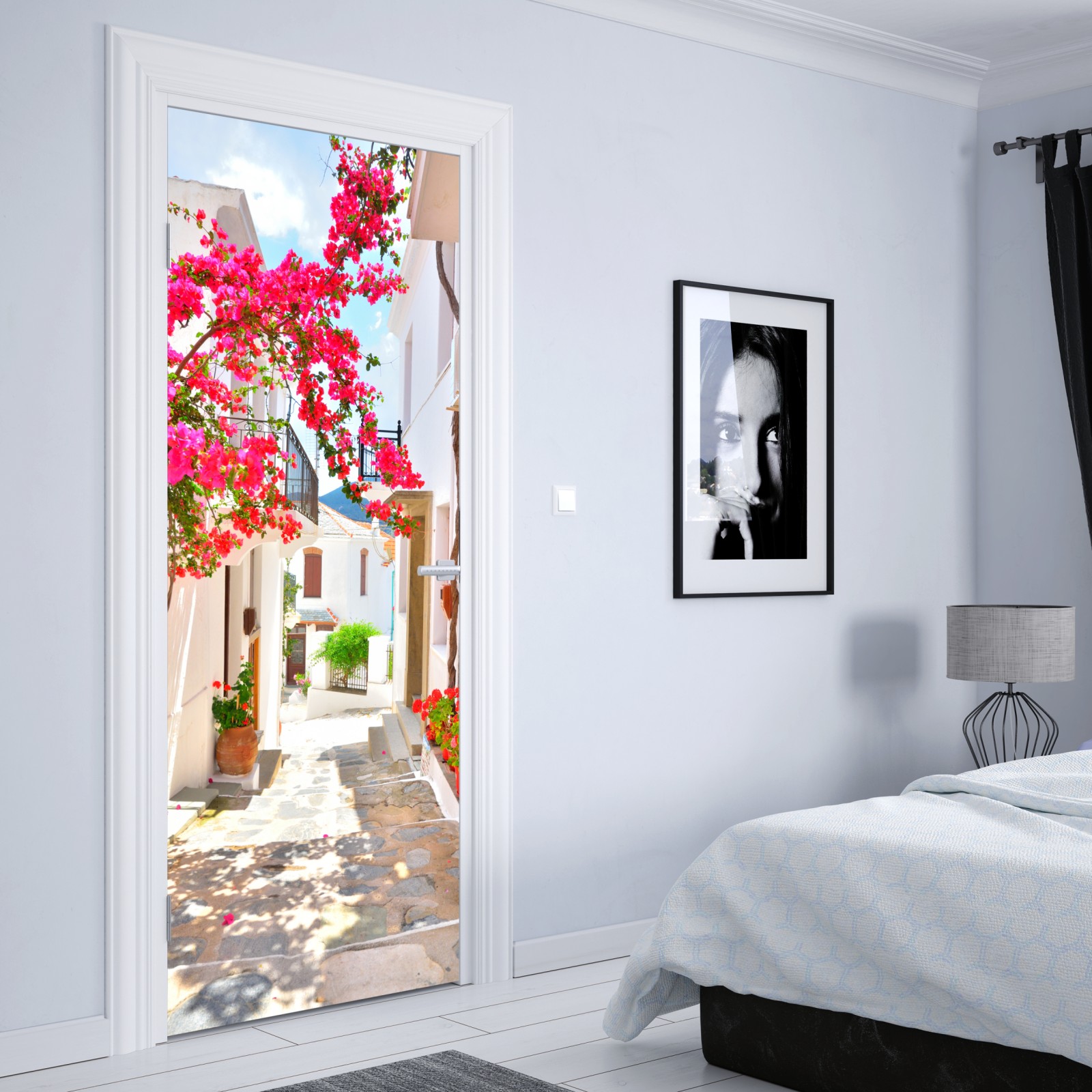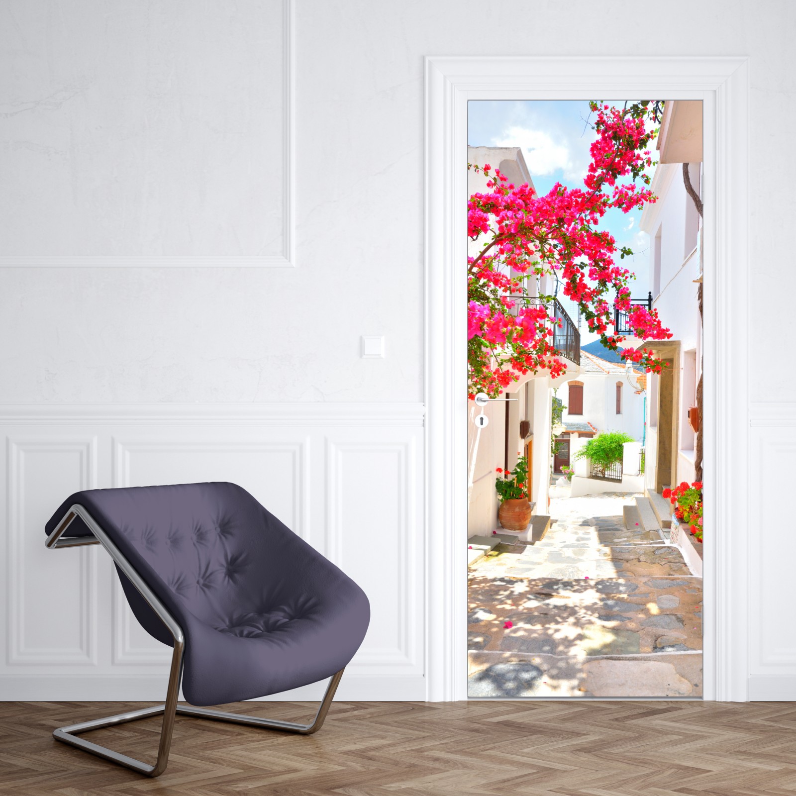 Naklejka na drzwi Słoneczny zaułek śródziemnomorski z bugenwillą
