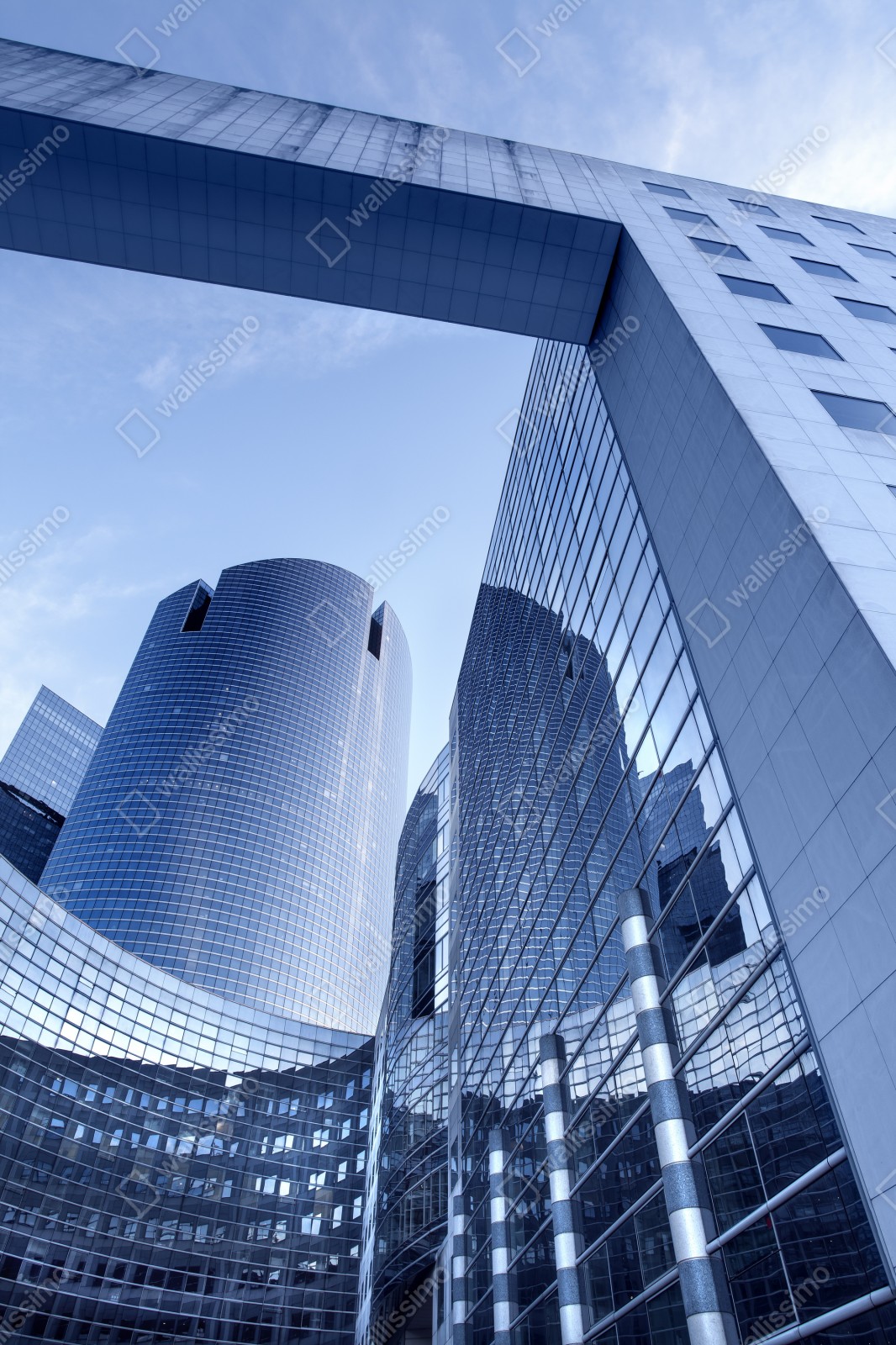 Odkryj uderzającą geometrię nowoczesnych wieżowców utrwalonych w chłodnych niebieskich tonach. Idealny do współczesnych wnętrz szukających architektonicznej elegancji.