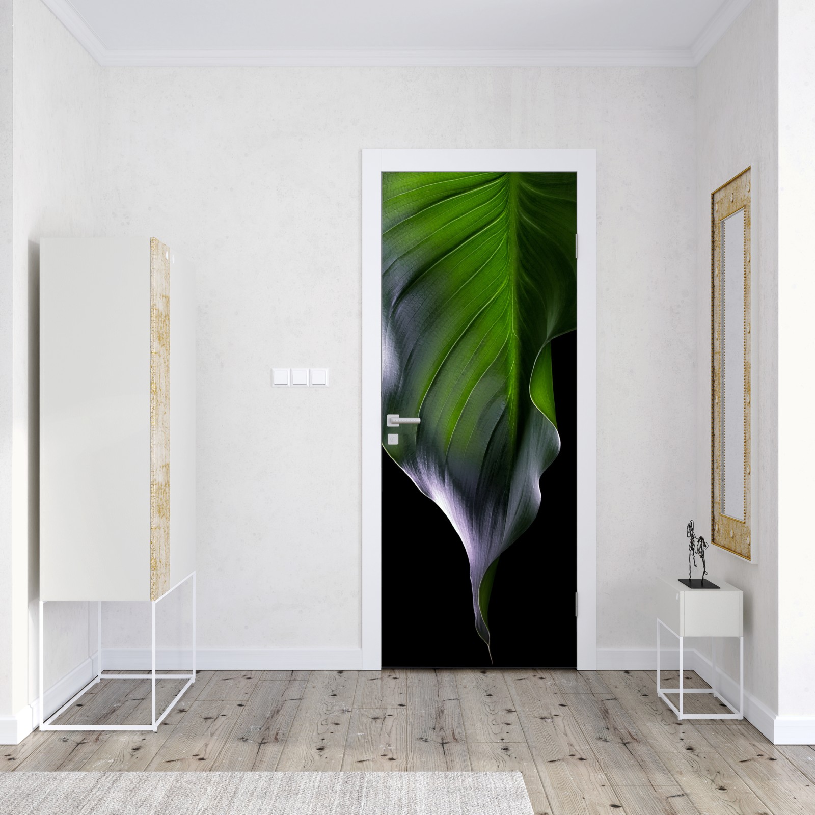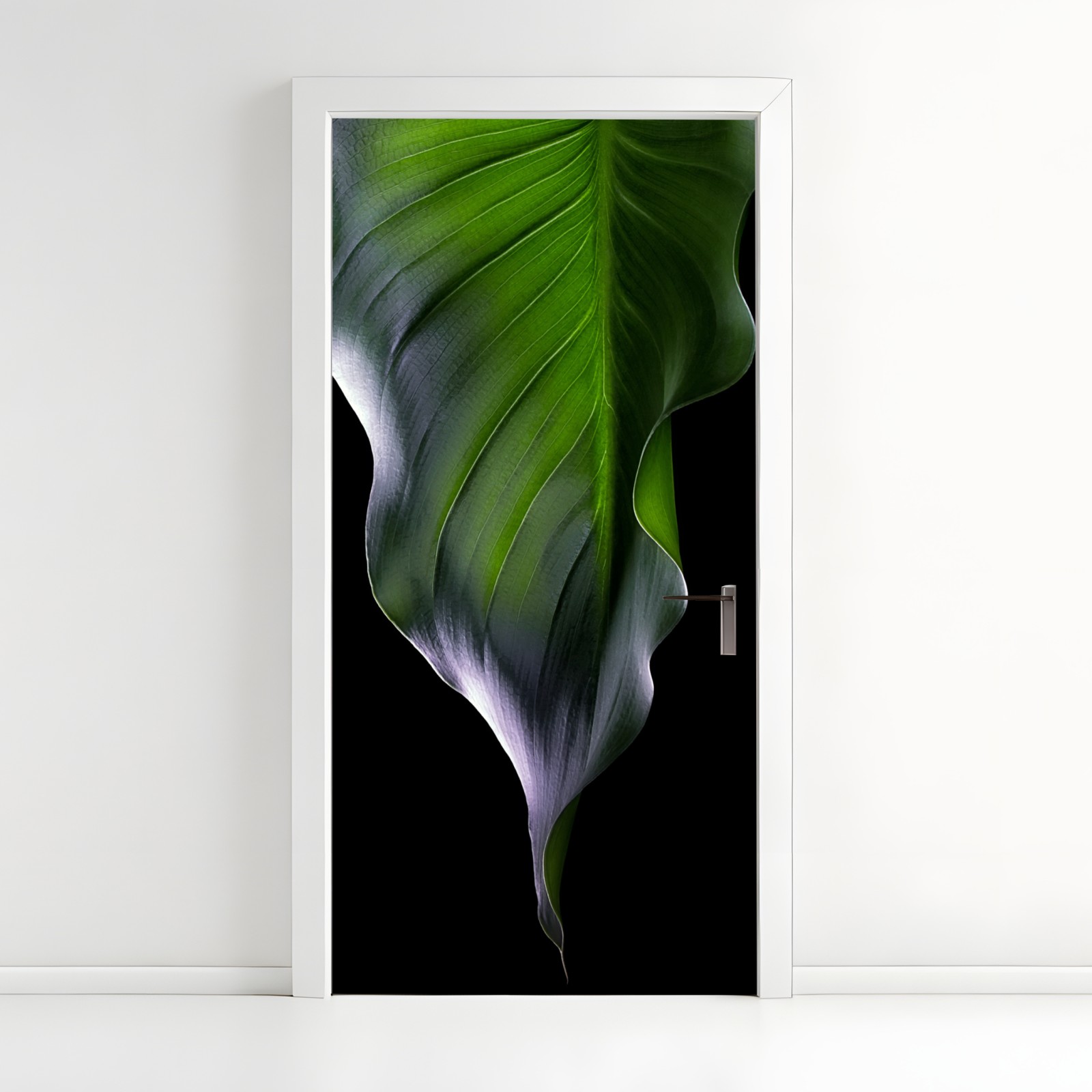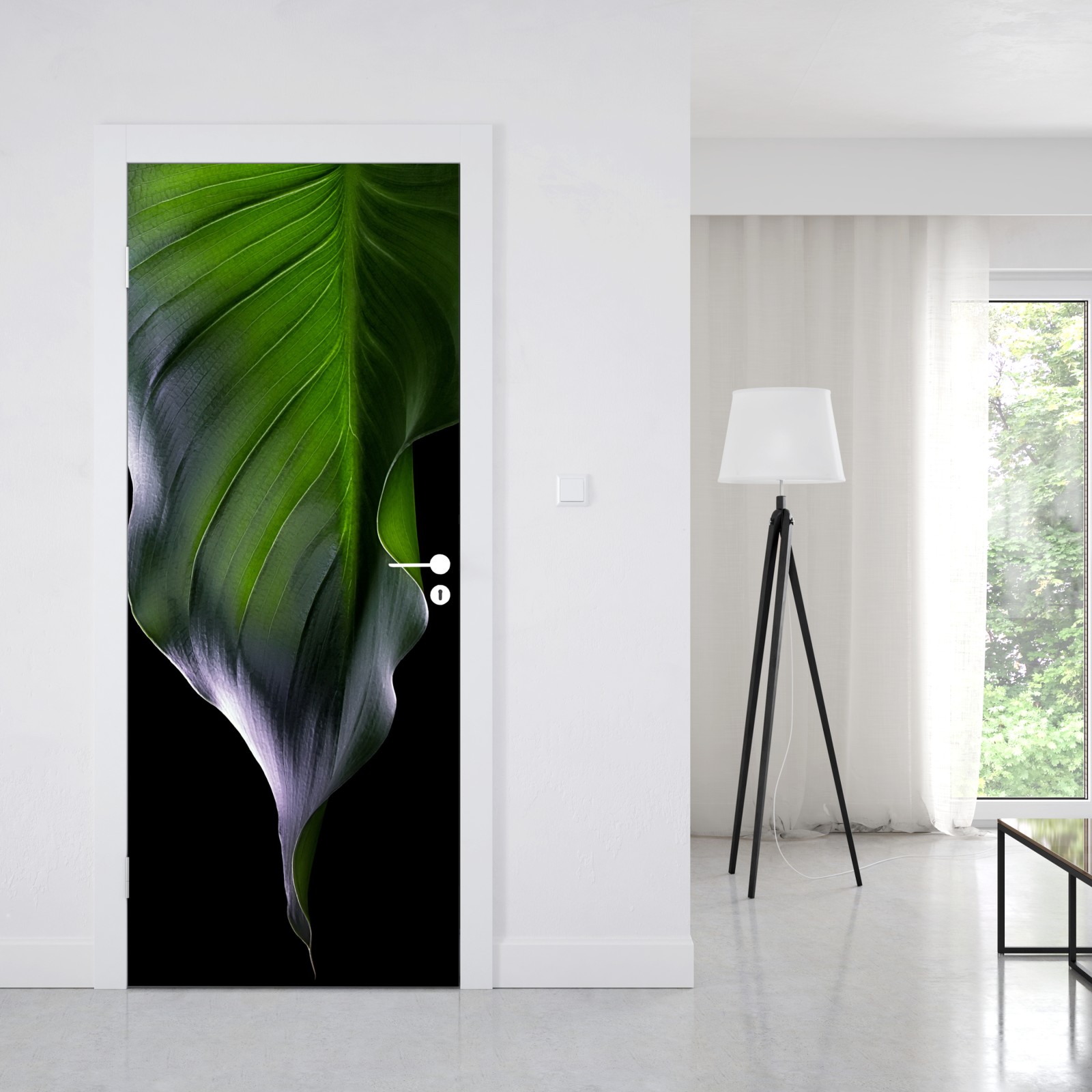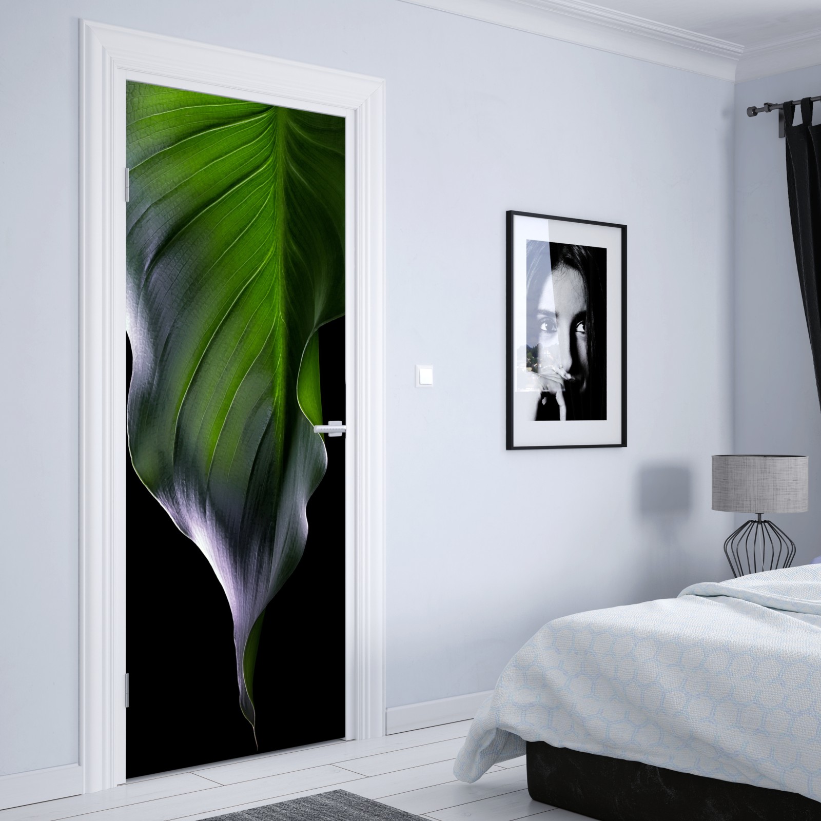 Naklejka na drzwi Elegancki zielony liść na czarnym tle