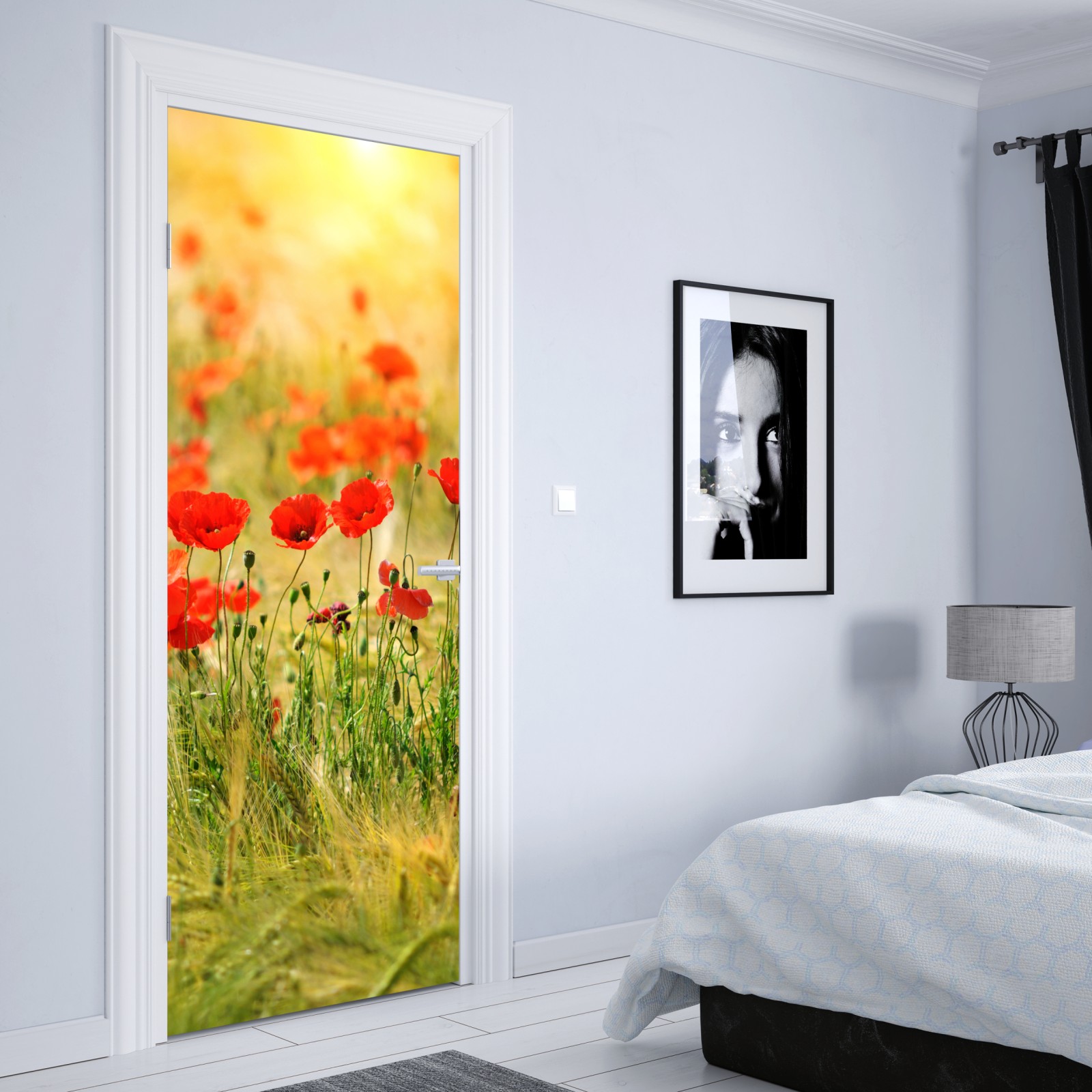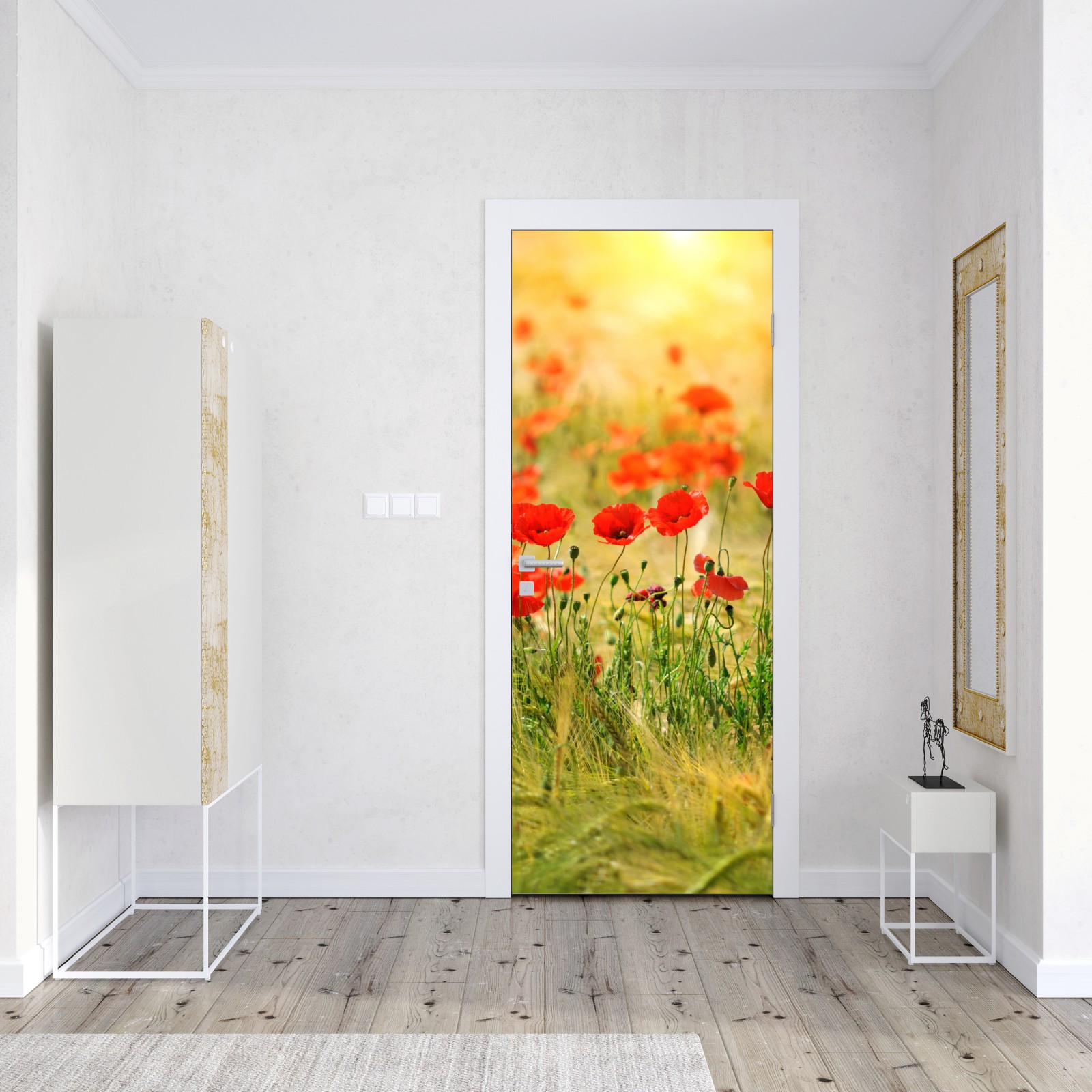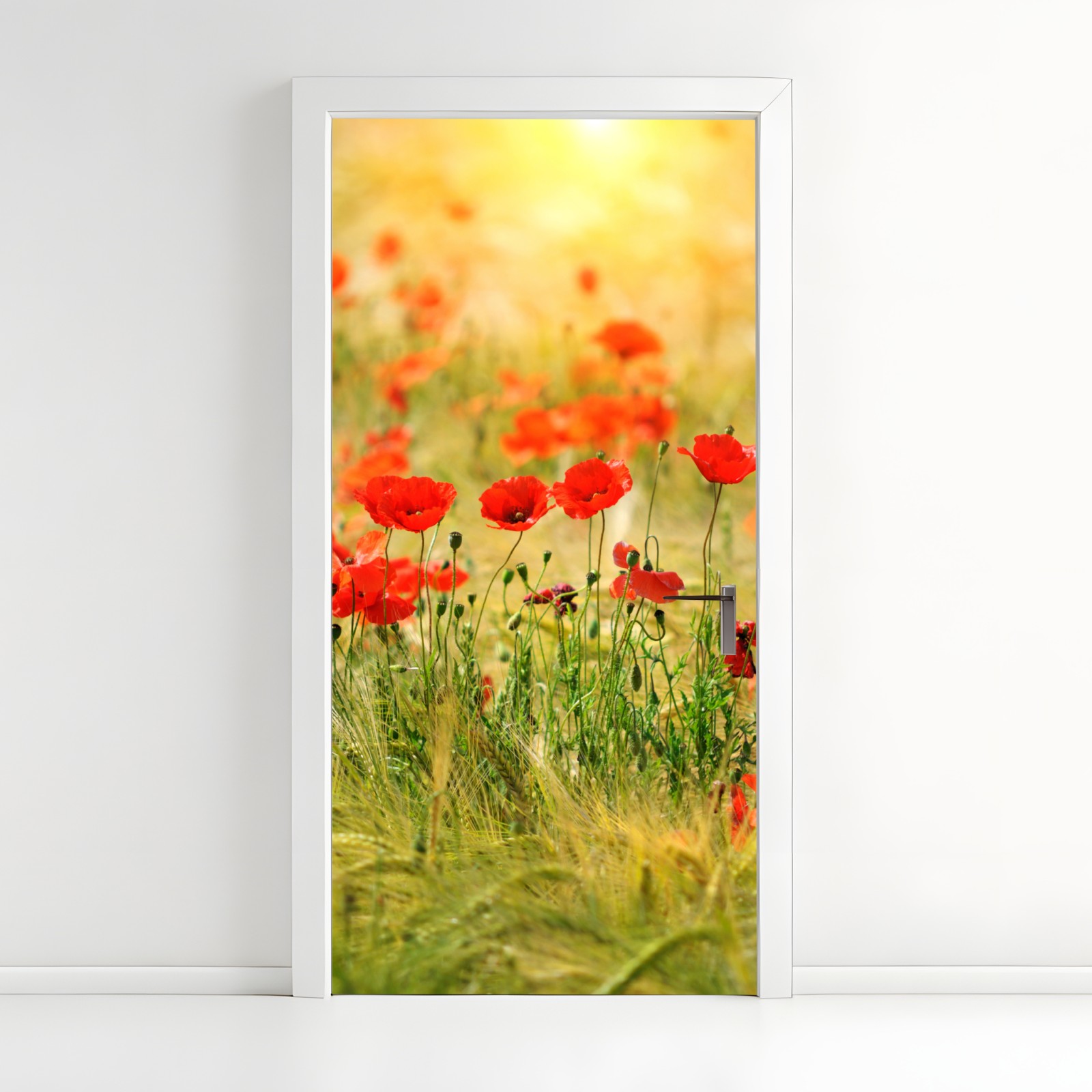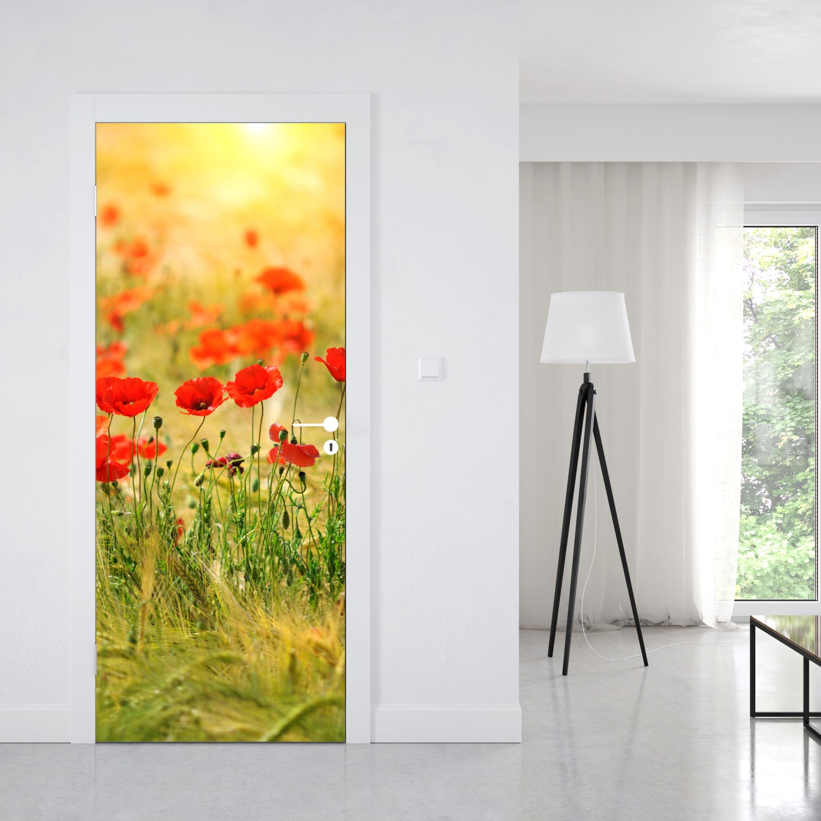 Naklejka na drzwi Łąka czerwonych maków w słońcu