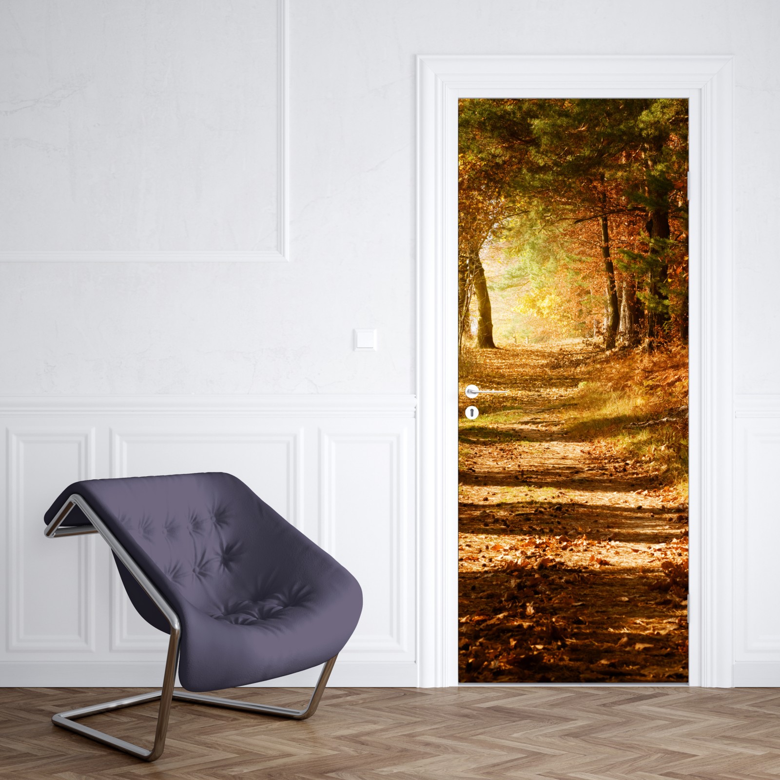 Naklejka na drzwi Jesienna leśna ścieżka ze złotym światłem