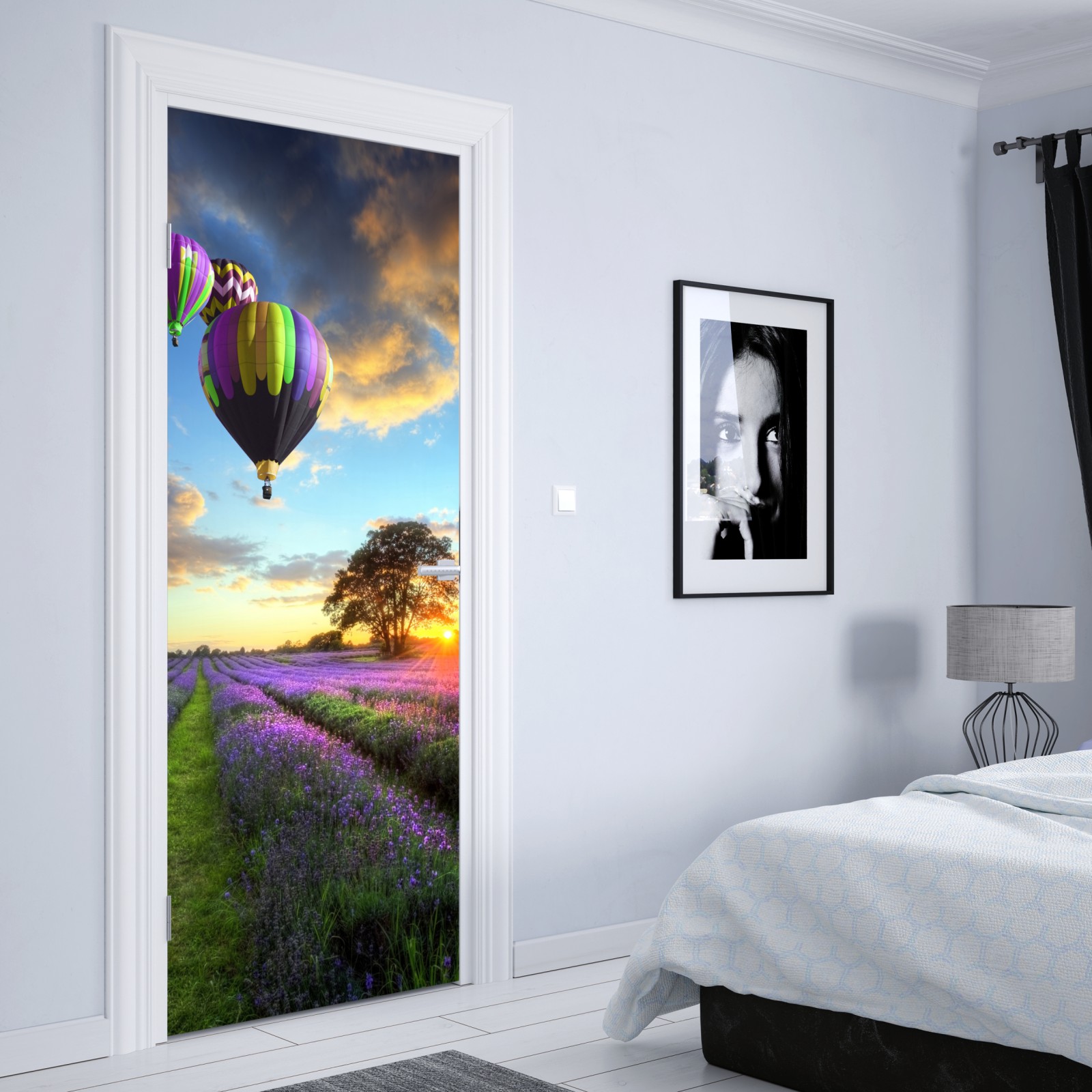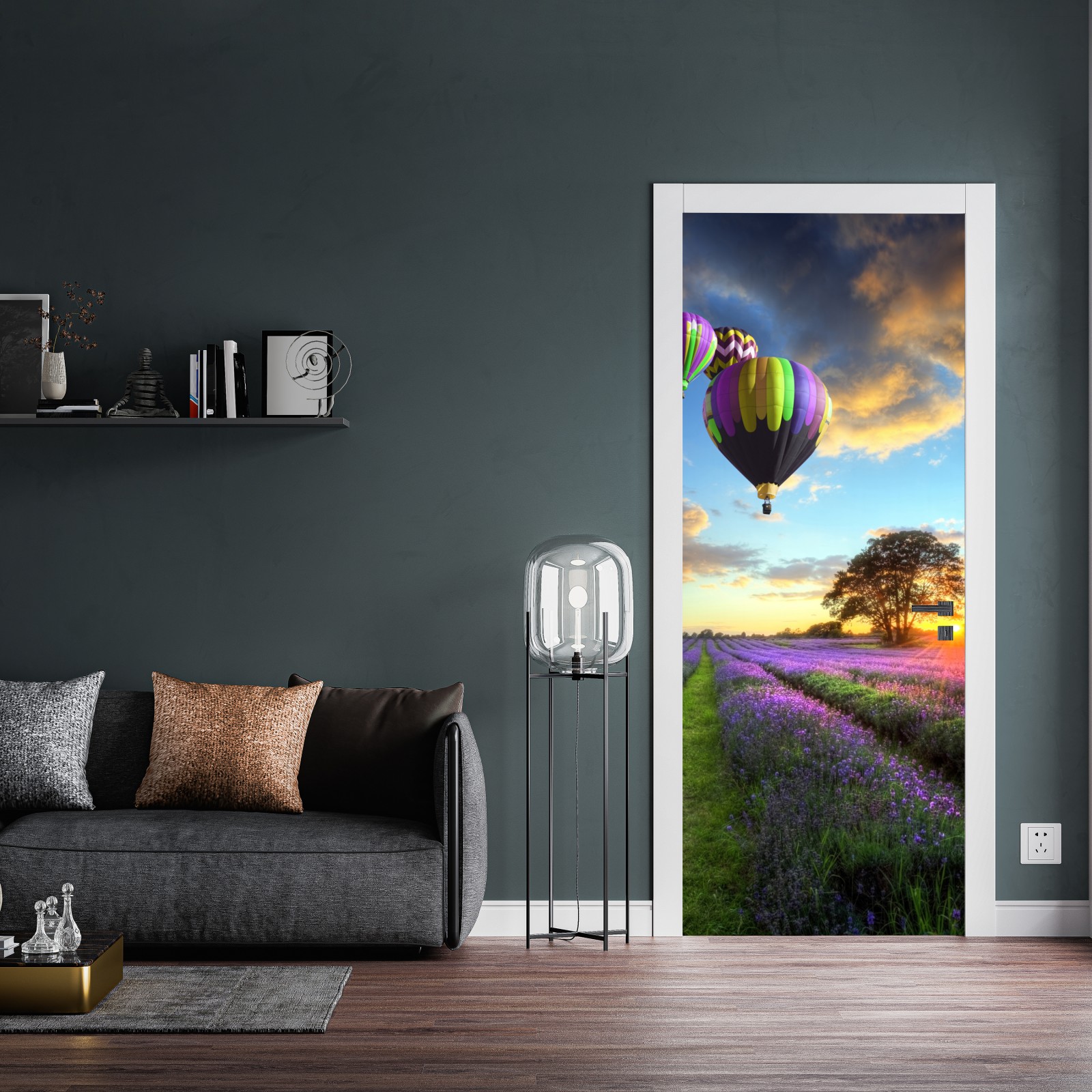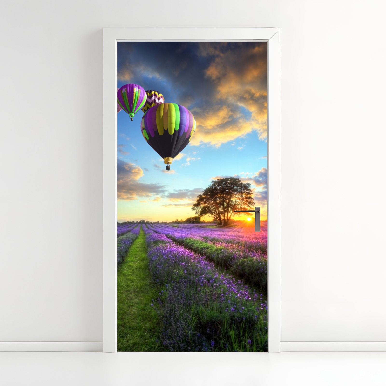 Naklejka na drzwi Lawendowy zachód słońca z kolorowymi balonami