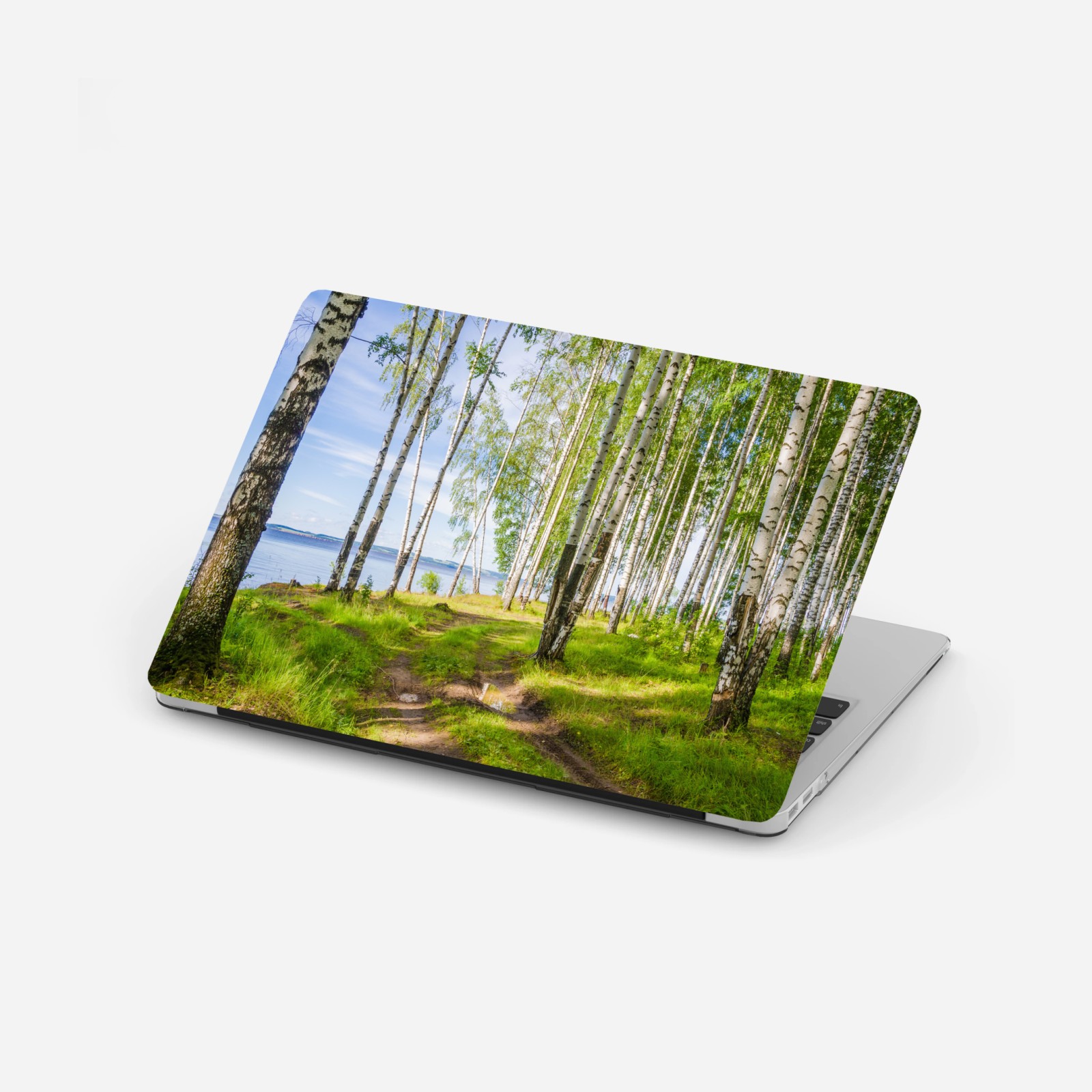 Naklejka na laptopa Słoneczny zagajnik brzozowy nad wodą
