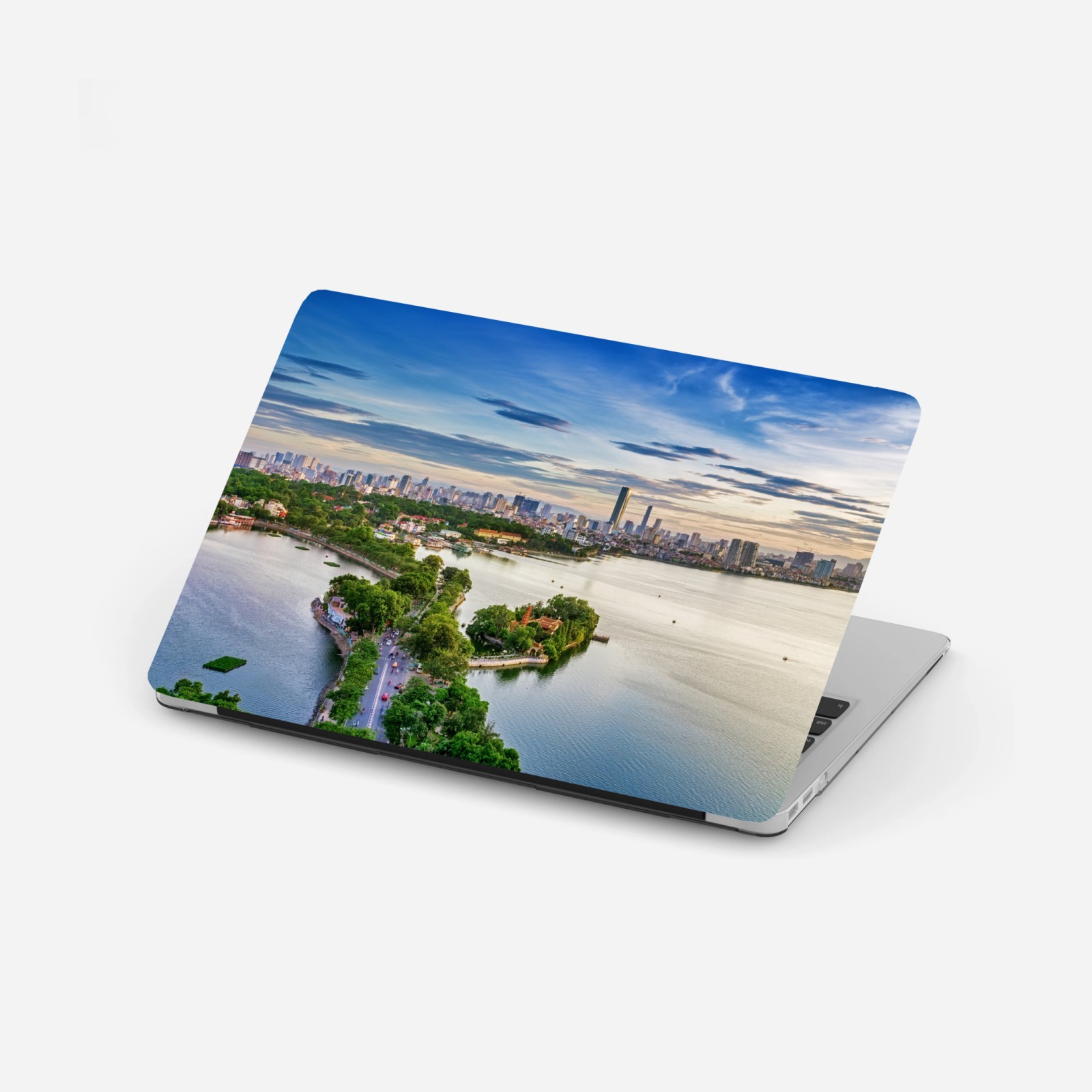 Naklejka na laptopa Spokojna miejska panorama nad jeziorem