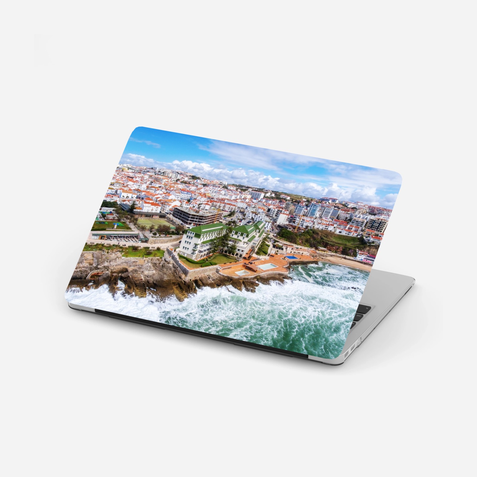 Naklejka na laptopa Widok z lotu ptaka na nadmorskie miasteczko z falami