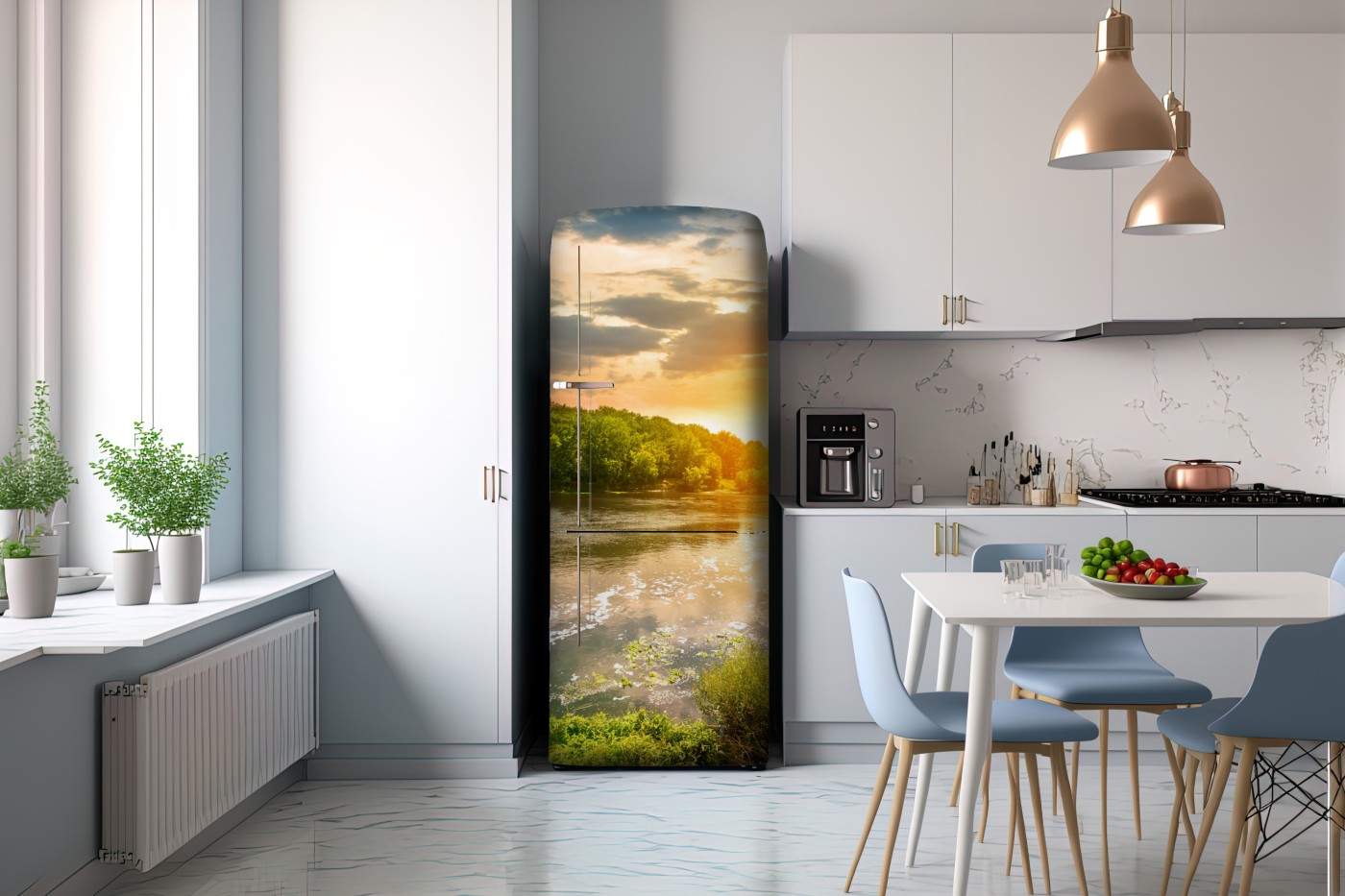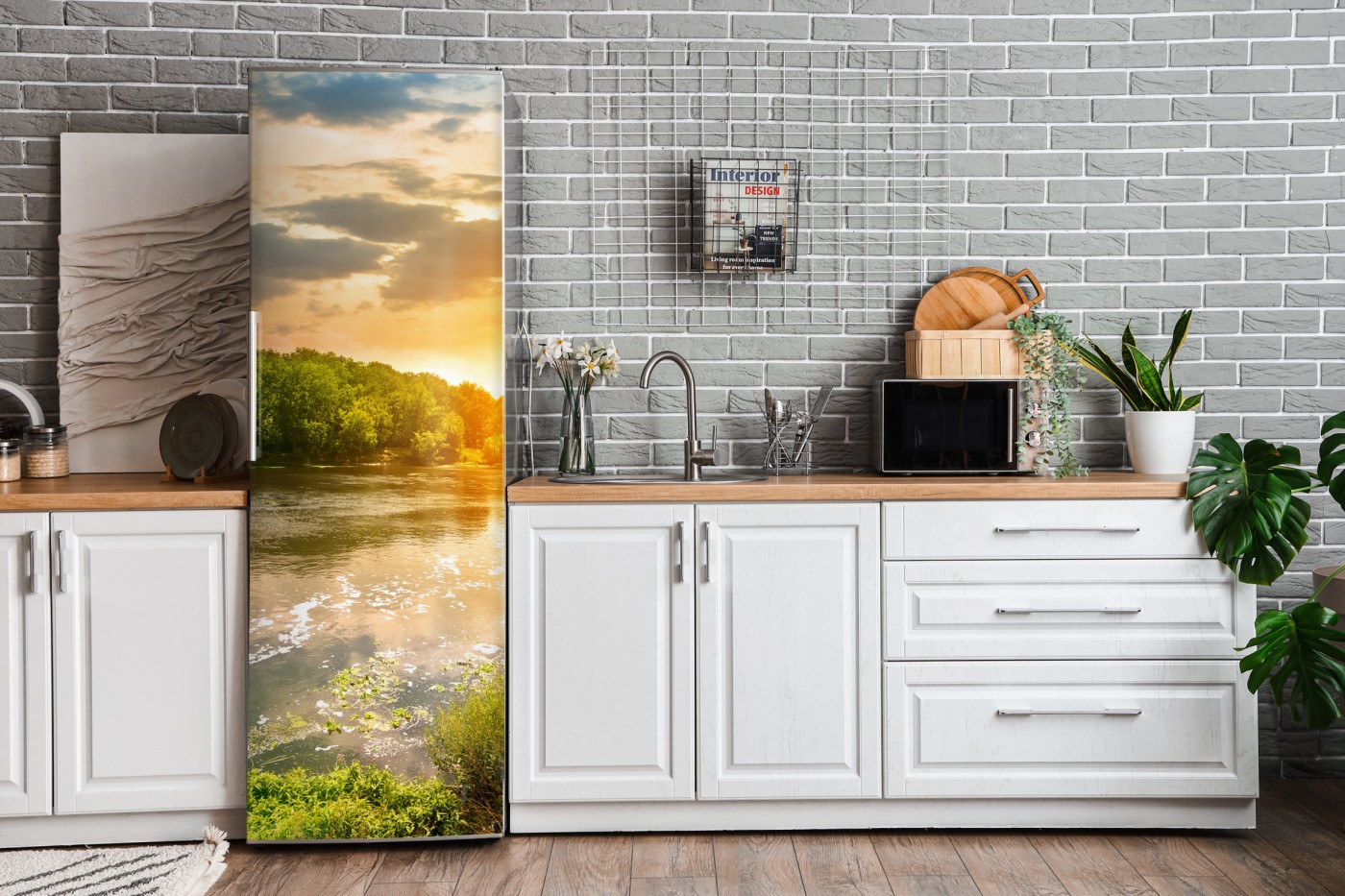 Naklejka na lodówkę Spokojny zachód słońca nad rzeką i zielonym lasem