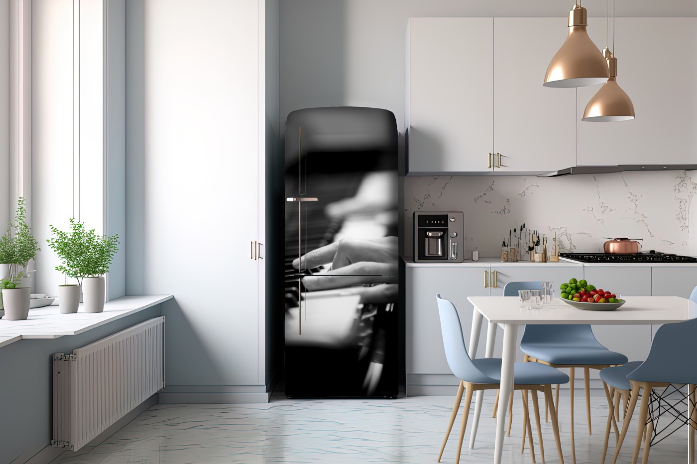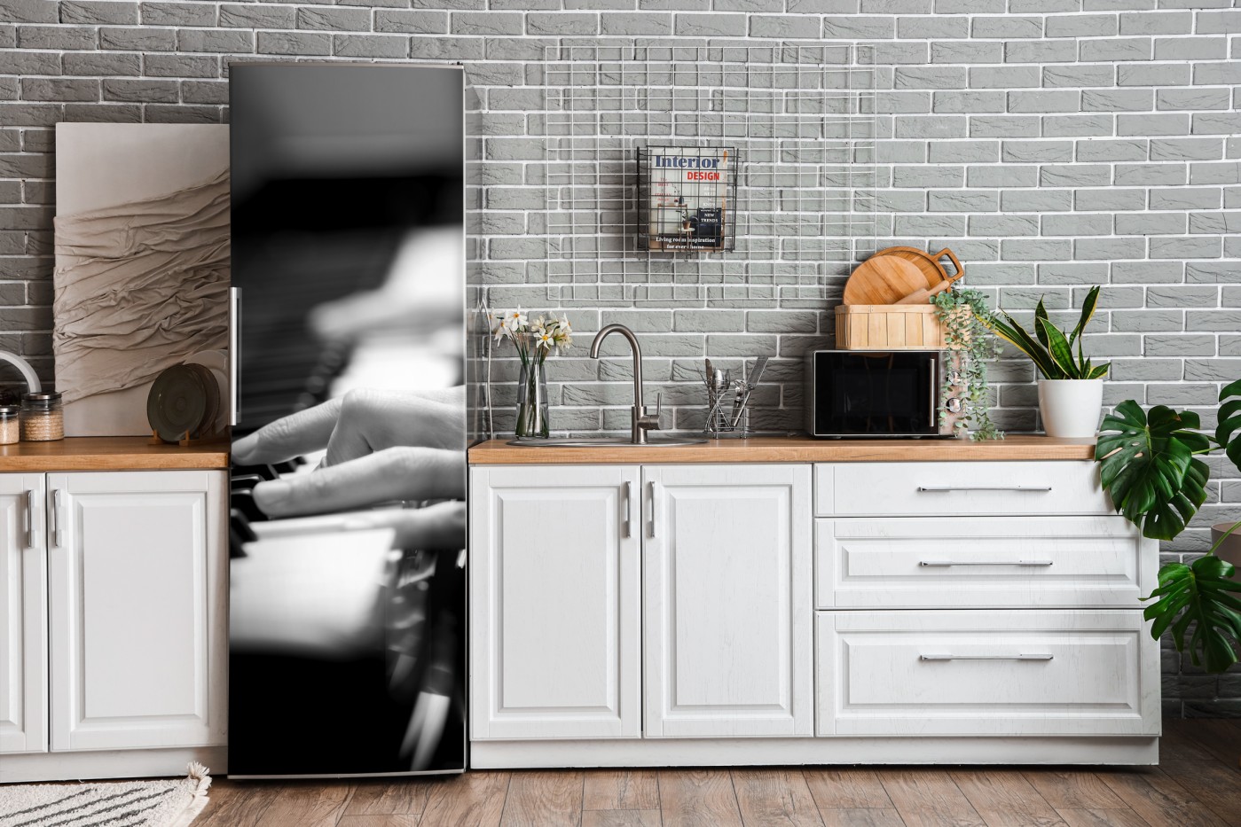 Naklejka na lodówkę Ręce przy klawiaturze fortepianu w czerni i bieli