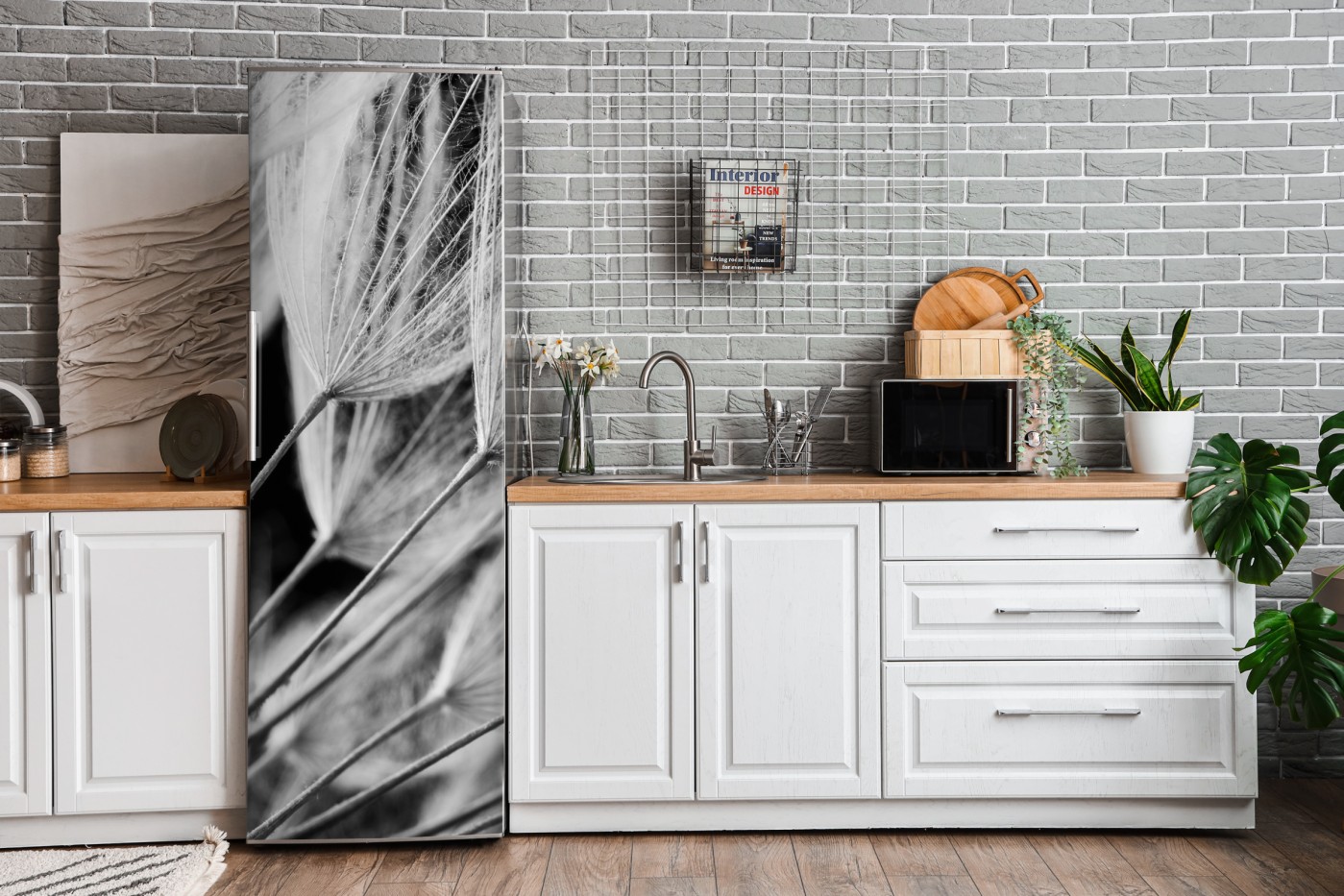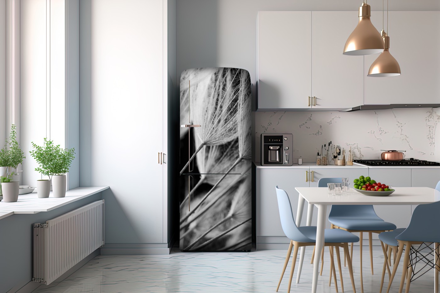 Naklejka na lodówkę Delikatne zbliżenie nasion dmuchawca czarno-białe