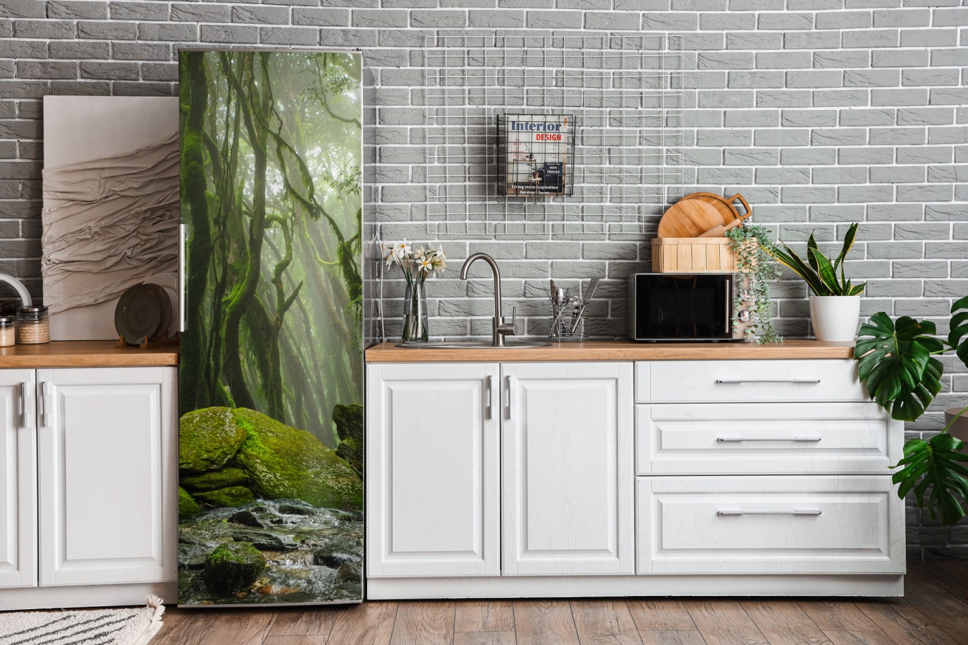 Naklejka na lodówkę Las ze strumieniem we mgle