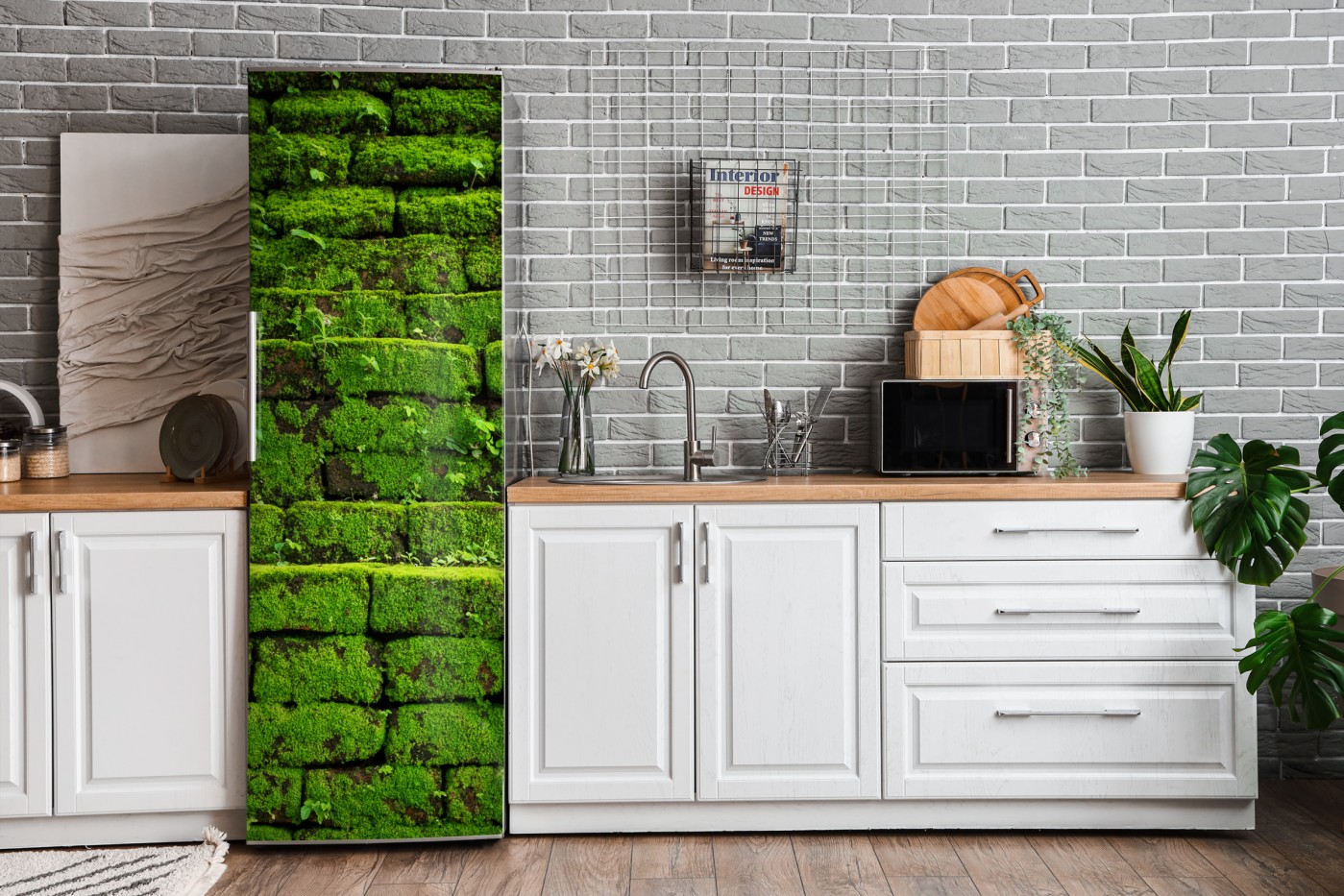 Naklejka na lodówkę Ściana z mchem na ceglanej strukturze