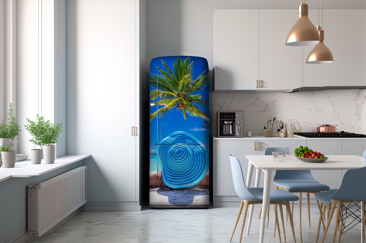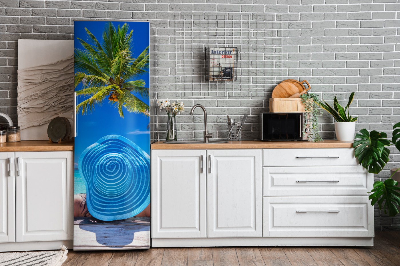 Naklejka na lodówkę Tropikalna plaża z niebieskim kapeluszem