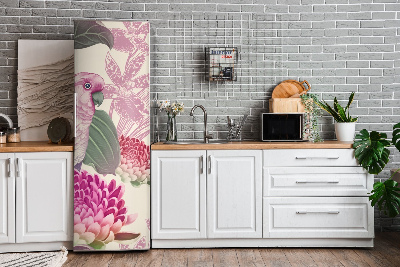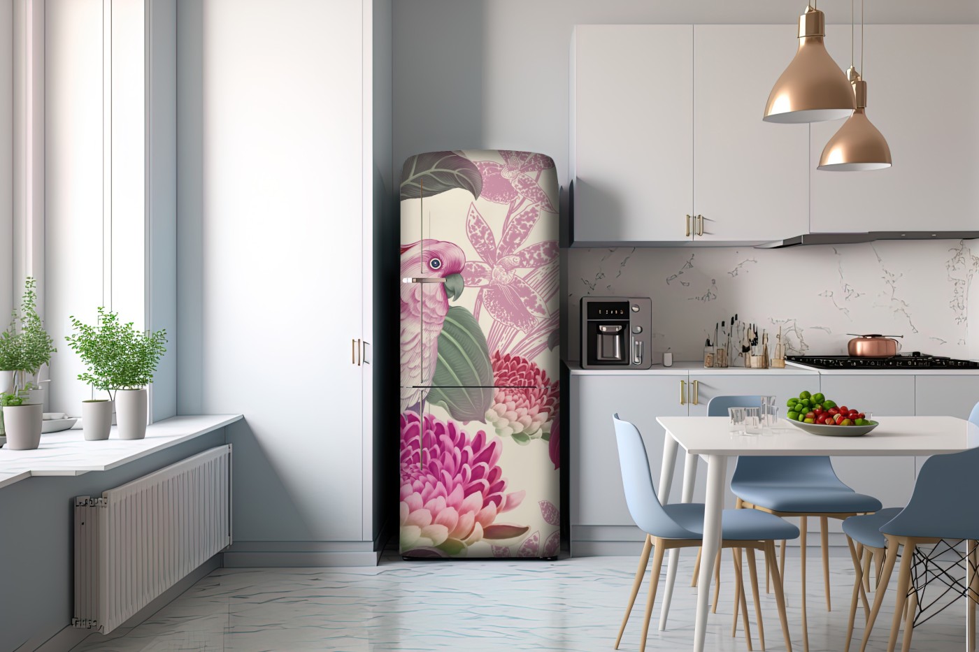Naklejka na lodówkę Różowa papuga i chryzantema - botaniczny motyw
