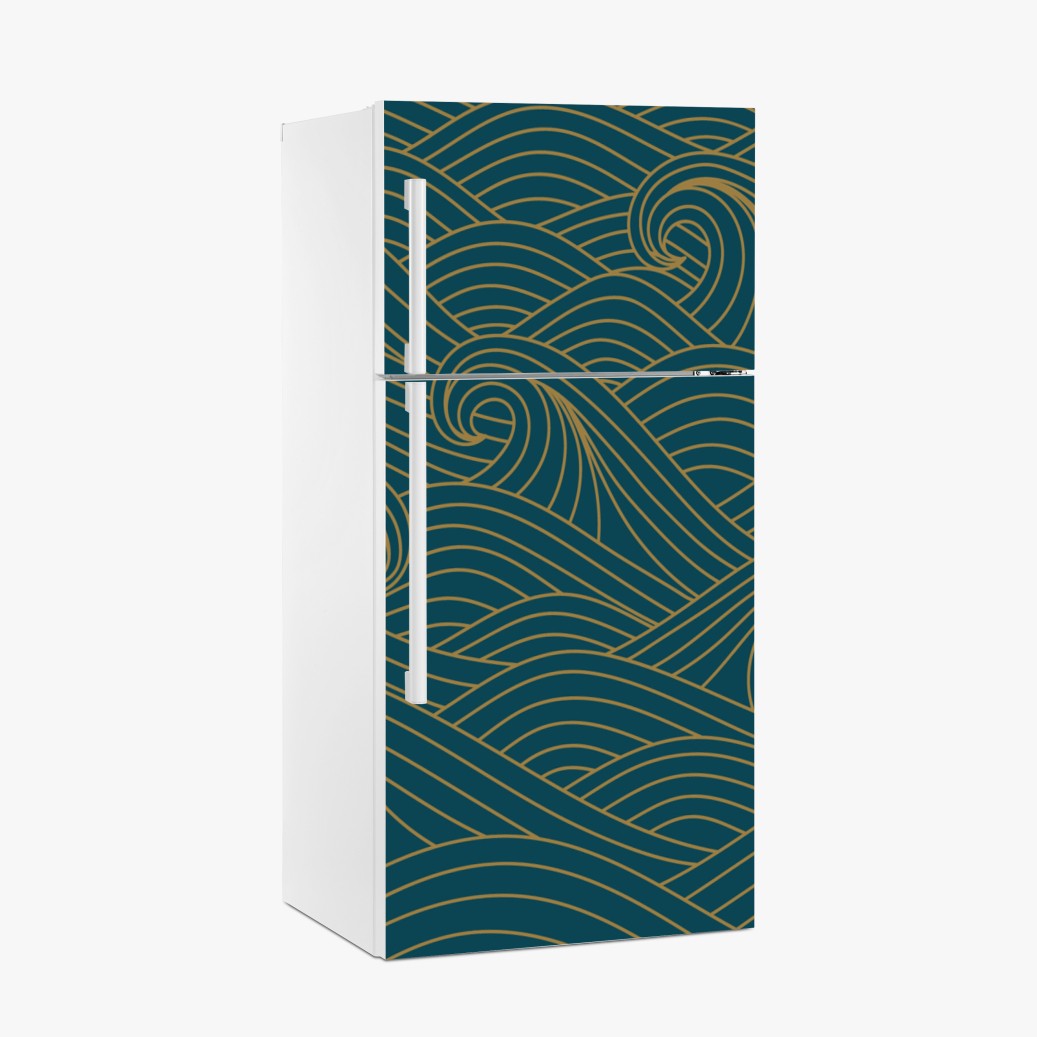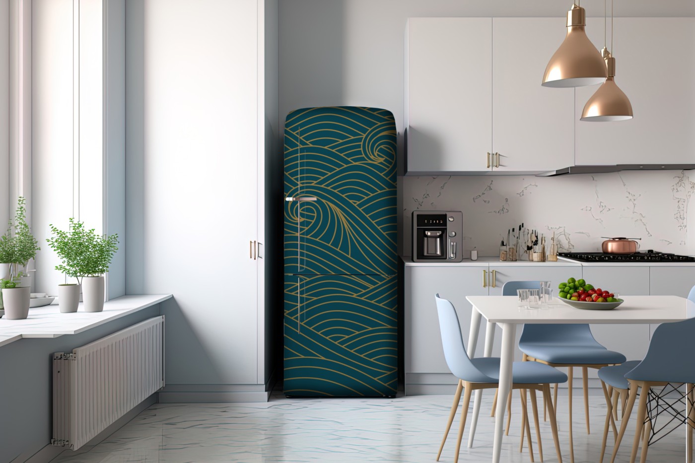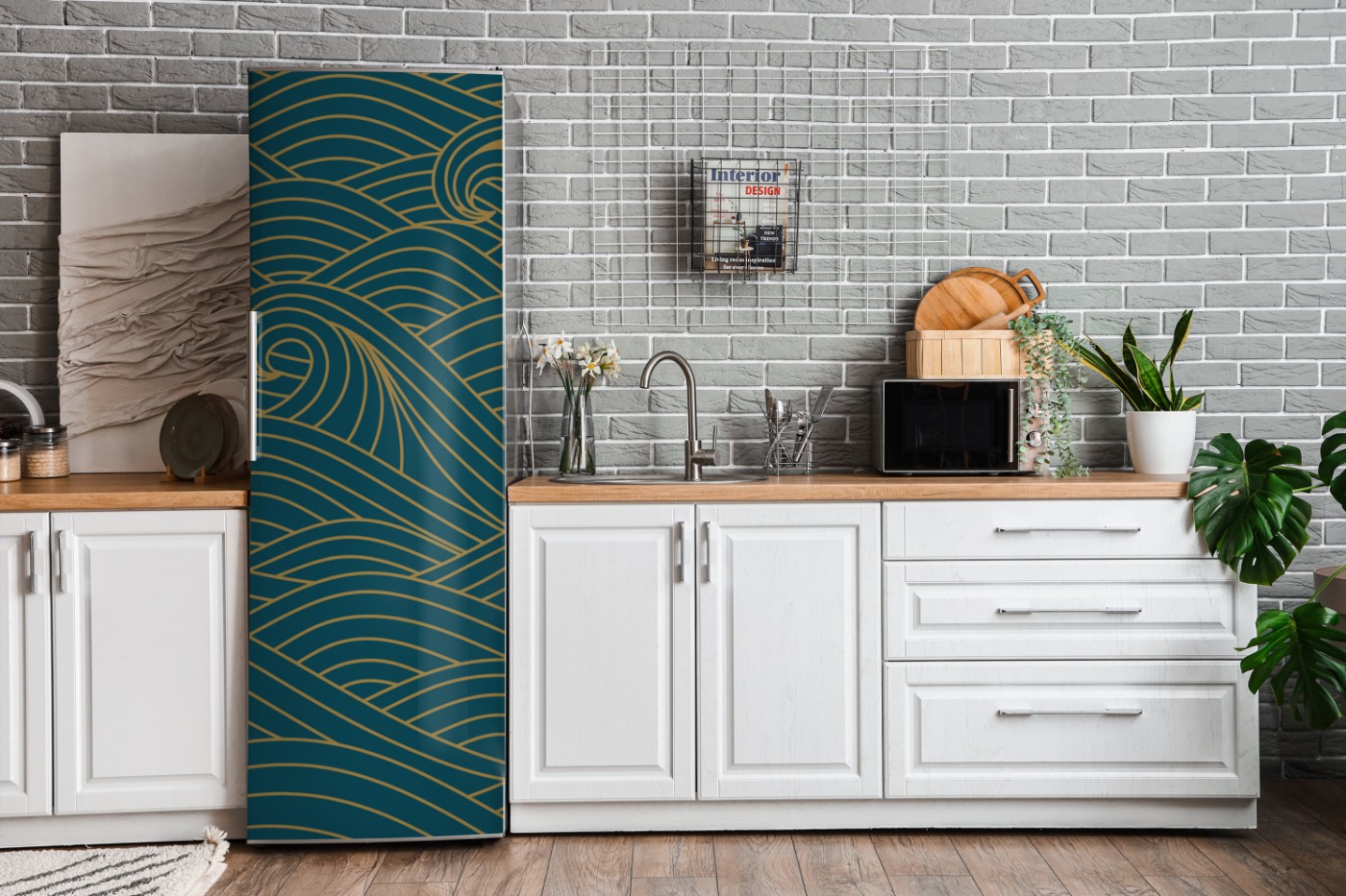 Naklejka na lodówkę Turkusowy wzór fal ze złotymi liniami