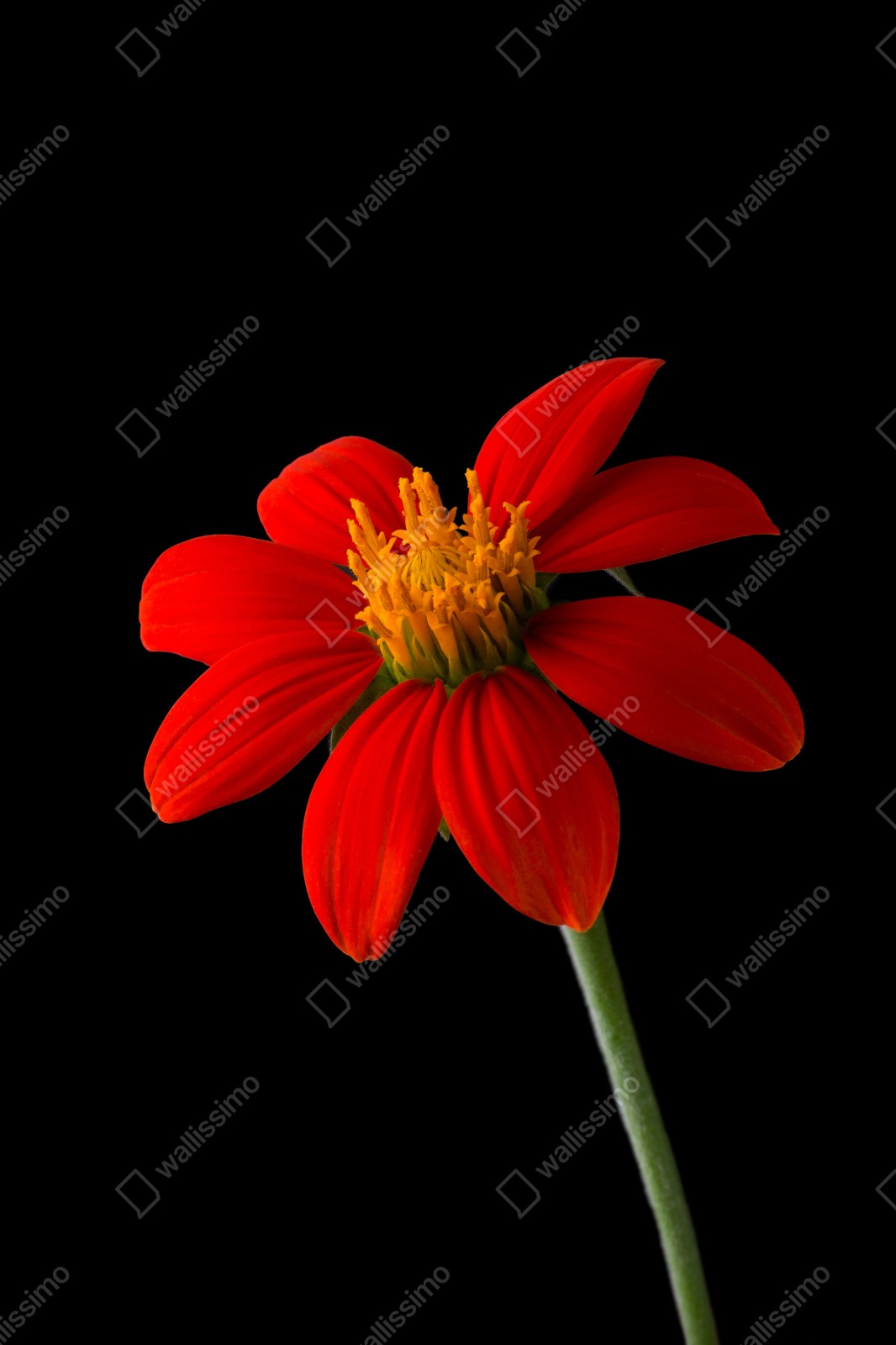 Jaskrawy czerwono-pomarańczowy słonecznik meksykański na głębokim czarnym tle wprowadza wyrazistą botaniczną elegancję do każdego wnętrza.