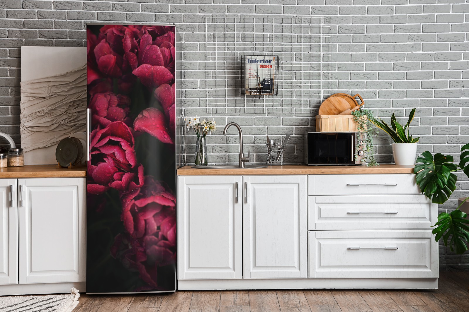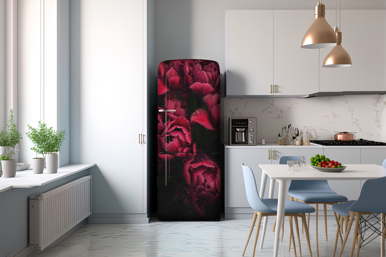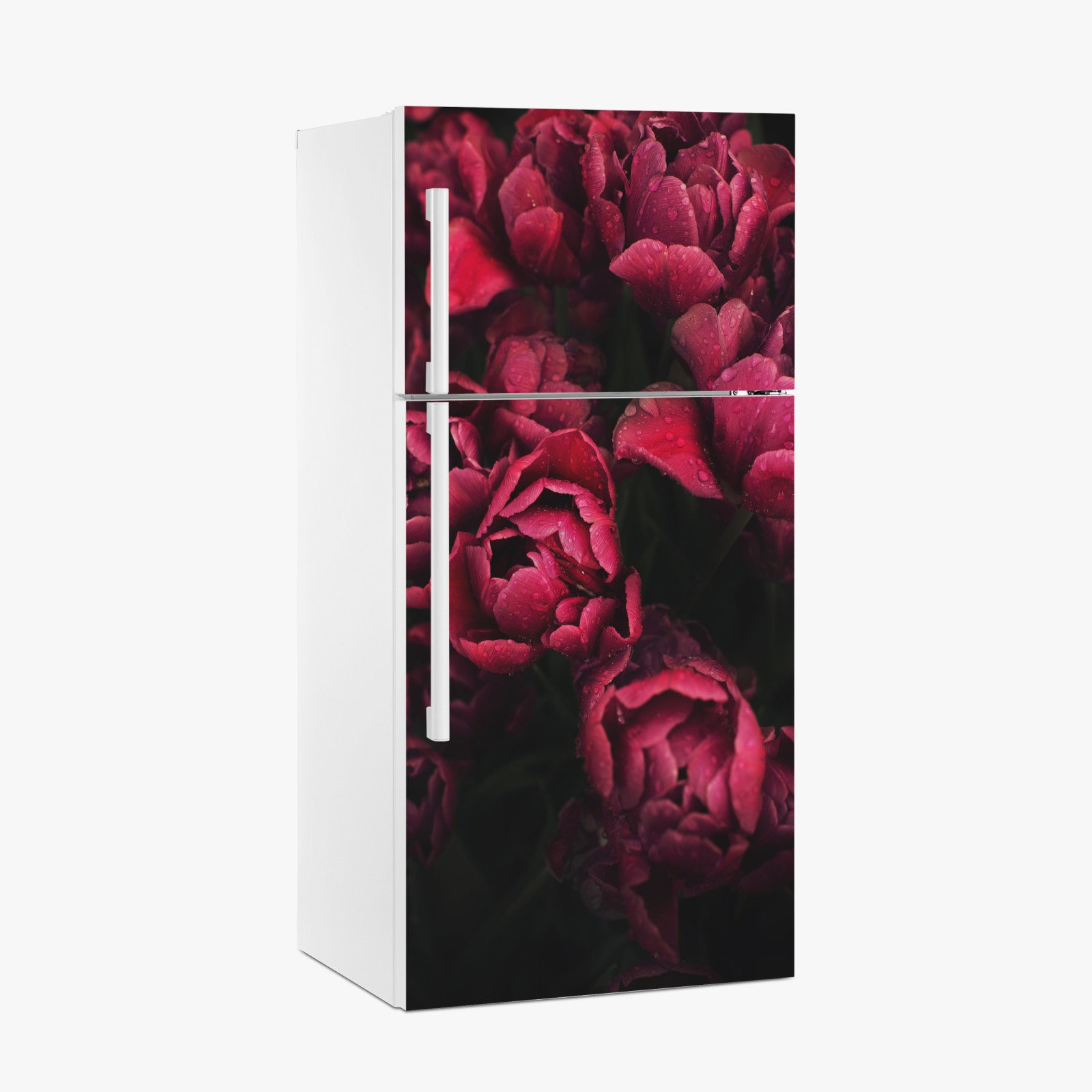 Naklejka na lodówkę Głębokie bordowe kwiaty z kroplami wody