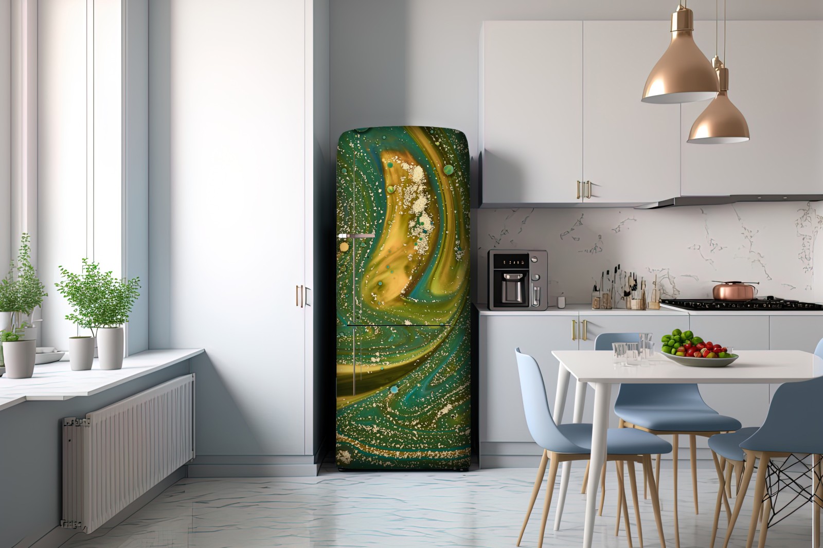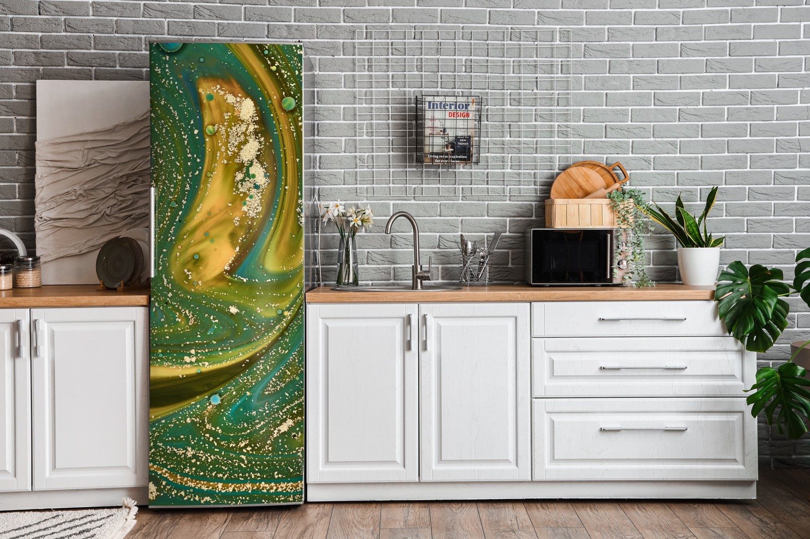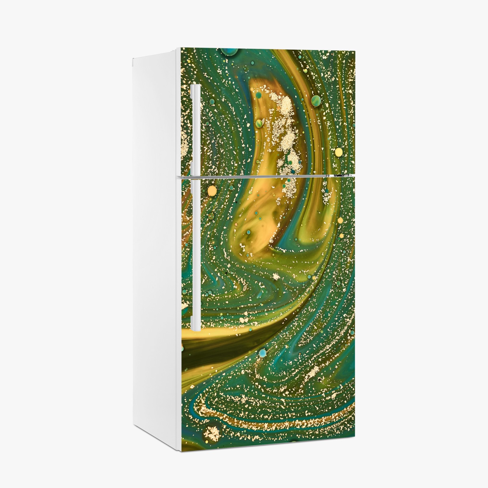 Naklejka na lodówkę Zielono-złota płynna marmurkowa grafika