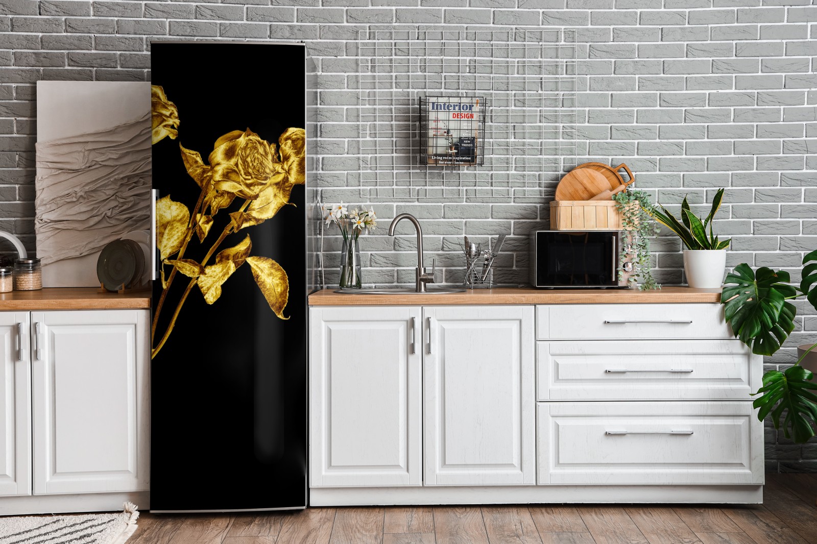 Eleganckie złote róże na głębokim czarnym tle dodają wnętrzu luksusu i wyjątkowego kontrastu.
