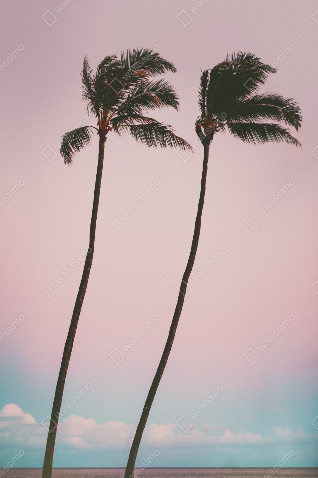 Wprowadź uspokajającą tropikalną atmosferę do wnętrza dzięki dwóm pastelowym palmom kołyszącym się nad spokojnym horyzontem morza.