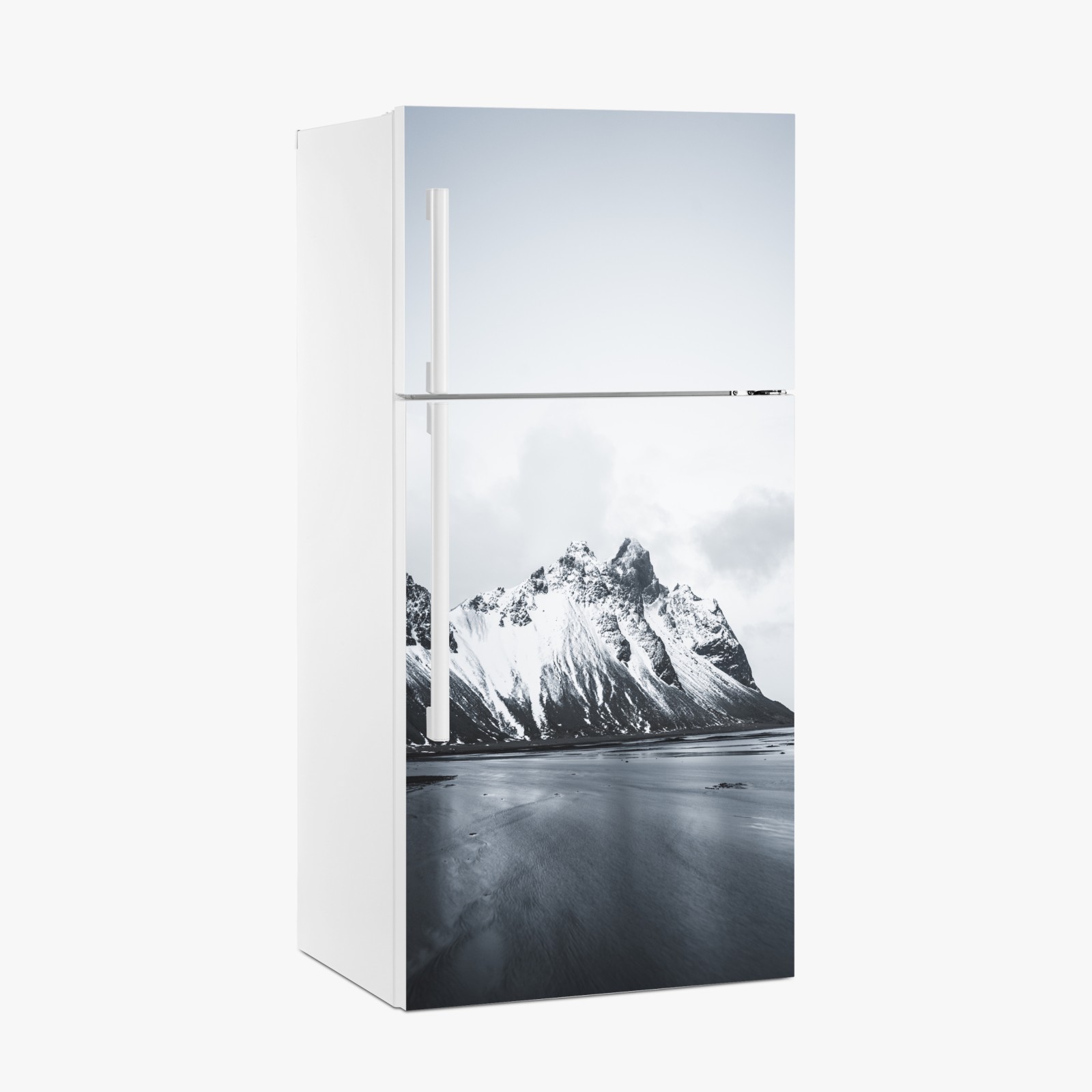 Naklejka na lodówkę Spokojny ośnieżony krajobraz górski nad morzem