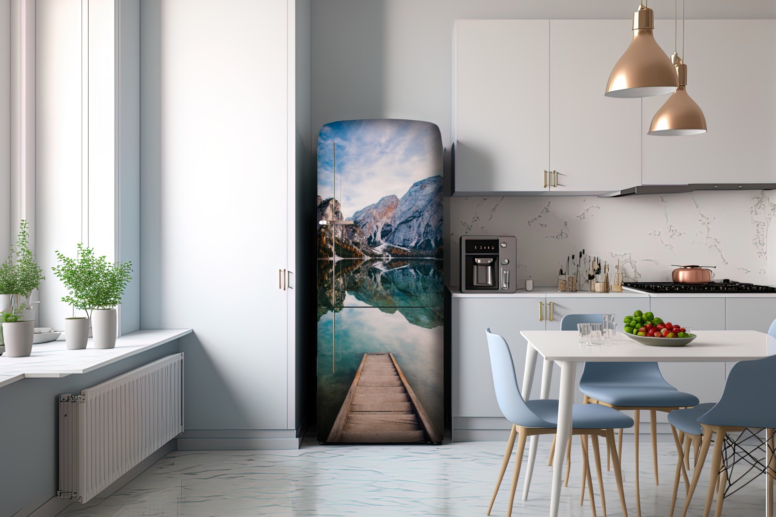 Naklejka na lodówkę Spokojne alpejskie jezioro z drewnianym pomostem
