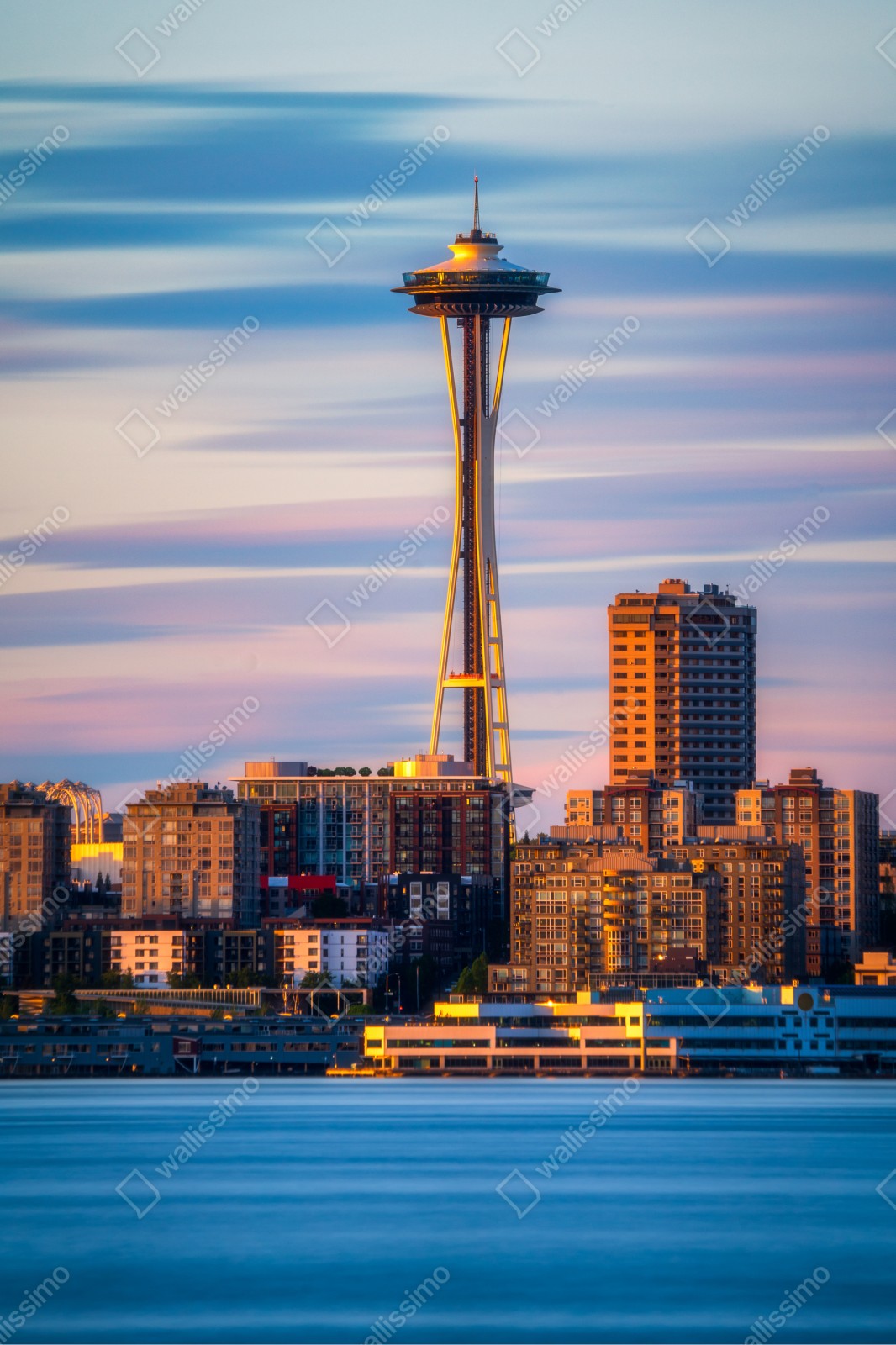 Ożyw swoje wnętrze widokiem panoramy Seattle z ikoniczną wieżą Space Needle skąpaną w świetle zachodu słońca.