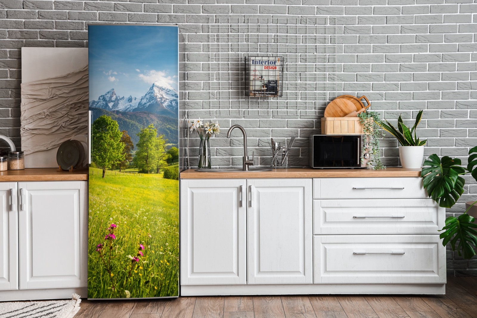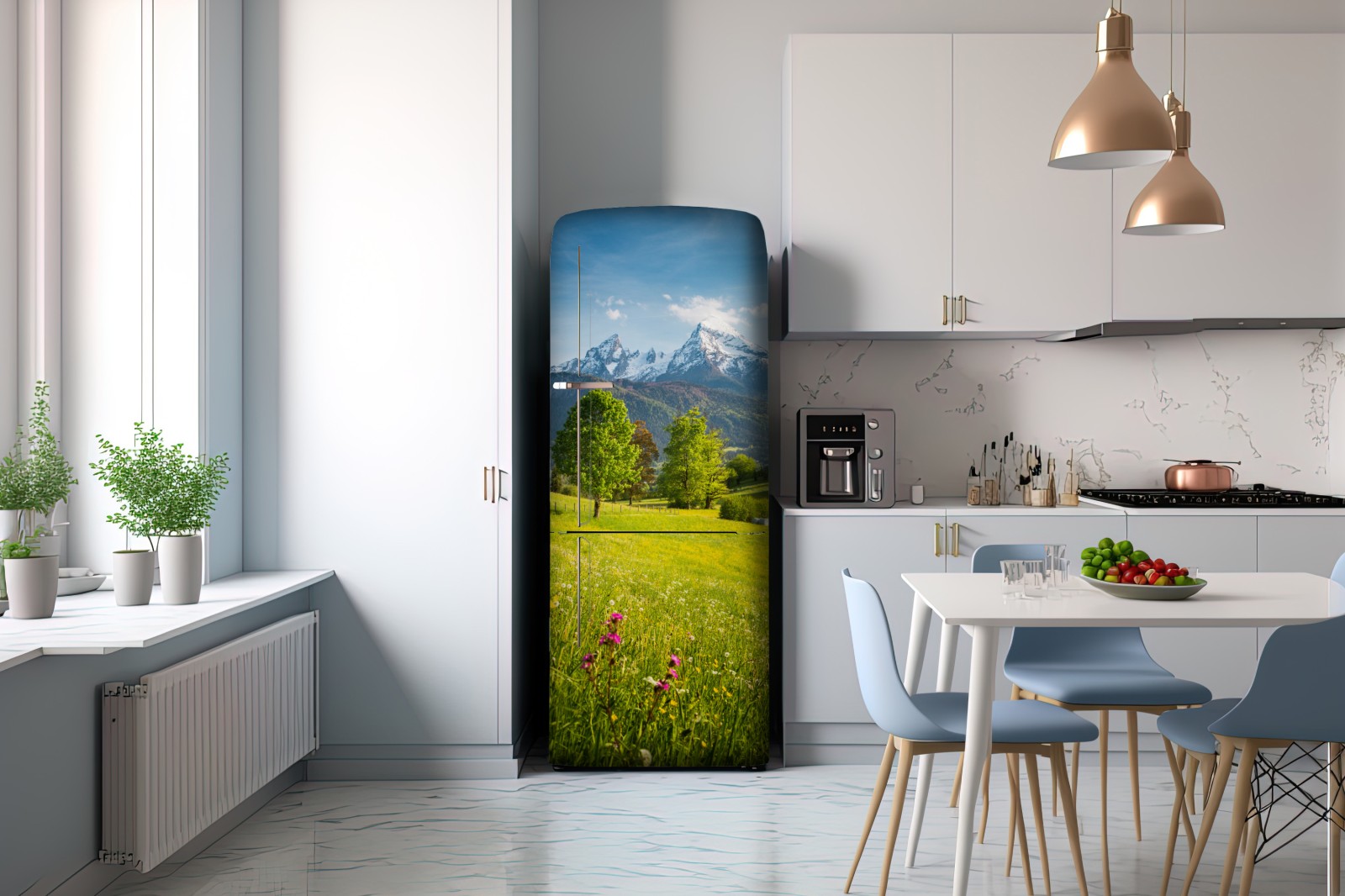 Naklejka na lodówkę Alpejska wiosenna łąka pod śnieżnymi szczytami