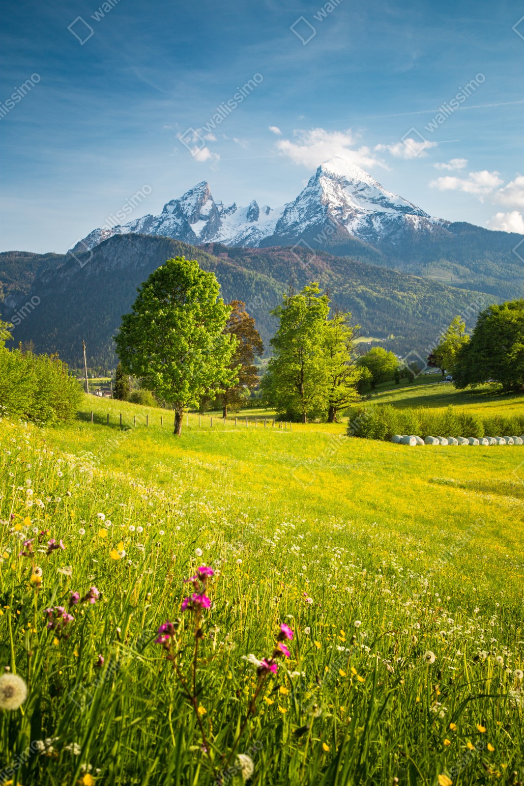 Wprowadź spokój alpejskich łąk i śnieżnych szczytów do swojego wnętrza dzięki temu żywemu wiosennemu krajobrazowi.