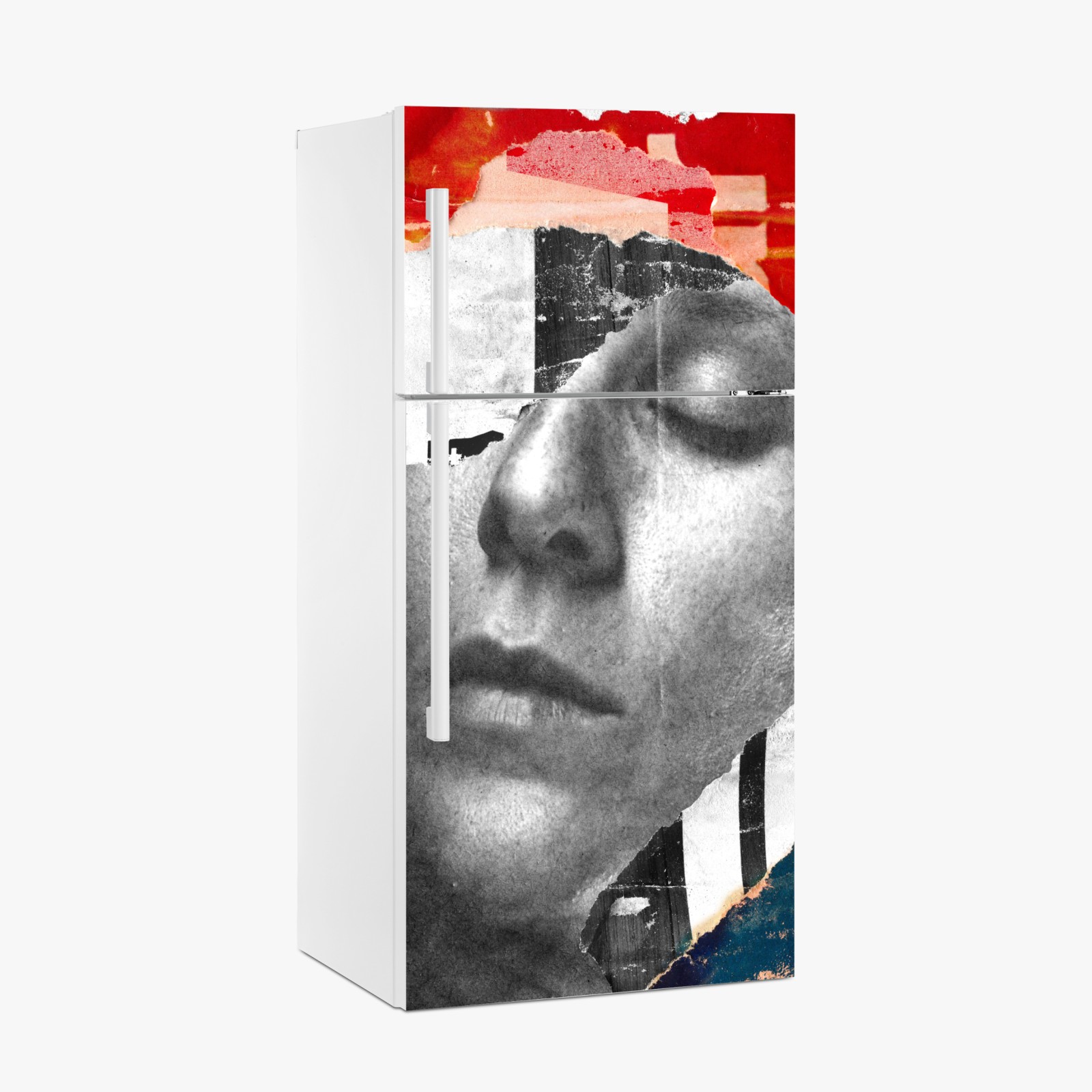 Odkryj uderzający kolaż z porozrywanym portretem łączący monochromatyczny portret z żywymi plamami koloru, tworząc miejski, emocjonalny punkt centralny w twoim wnętrzu.