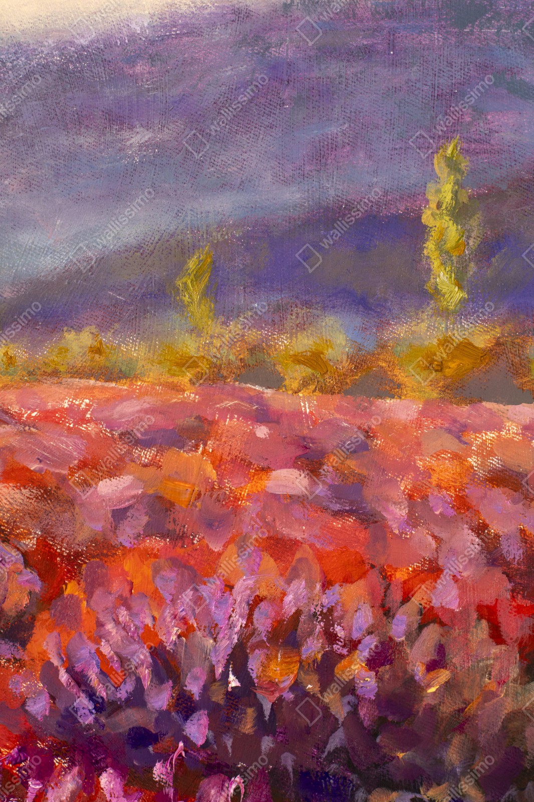 Wprowadź do wnętrza kojący klimat prowansalskiego pola lawendy dzięki temu impresjonistycznemu obrazowi olejnemu łączącemu delikatne fiolety i ciepłe akcenty.