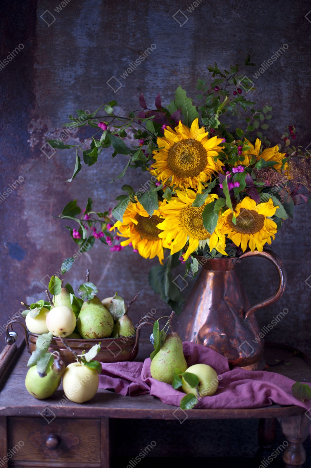 Pełne ciepła słoneczniki i dojrzałe gruszki tworzą rustykalną kompozycję, która wnosi jesienny nastrój do wnętrza.
