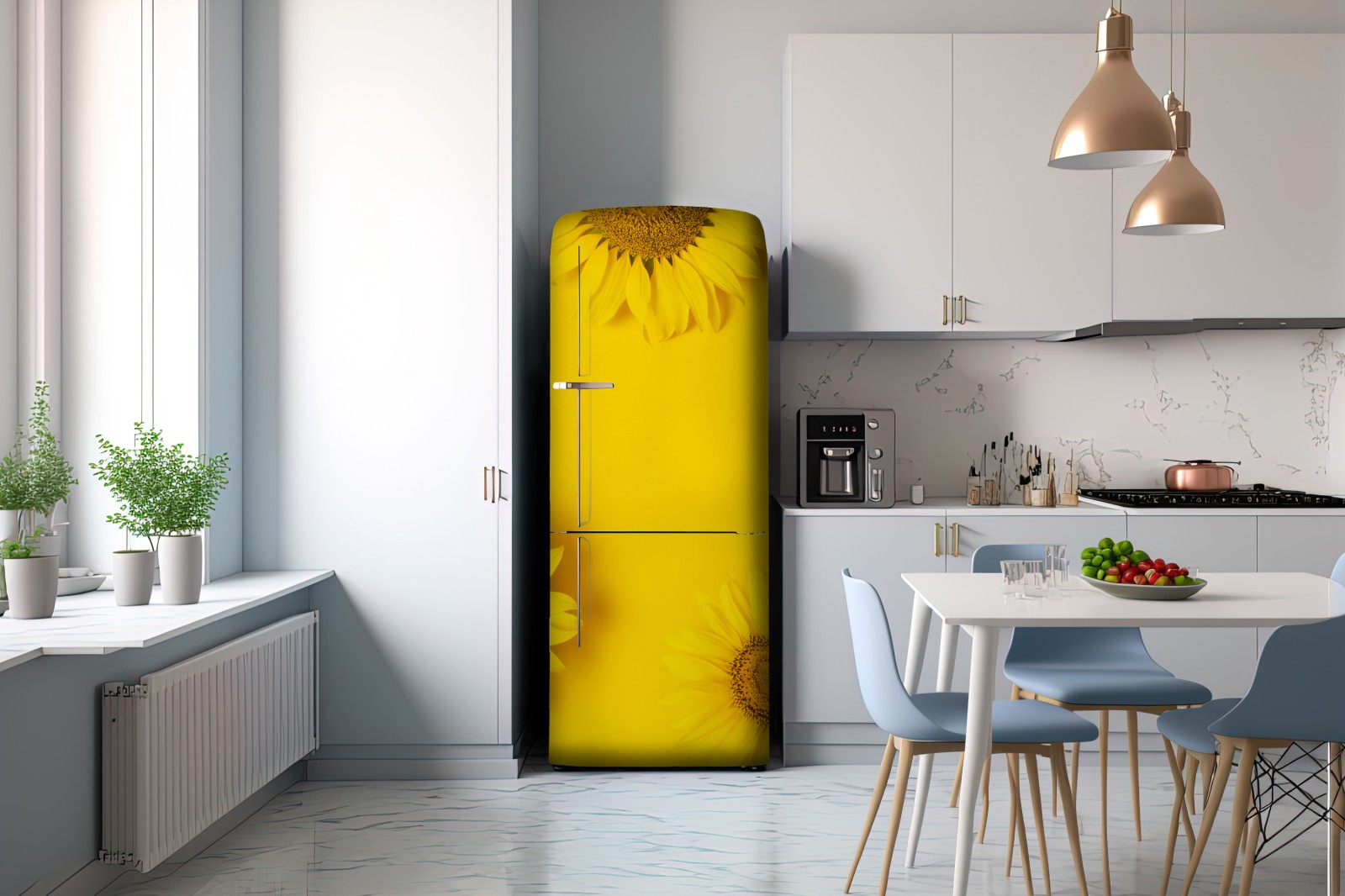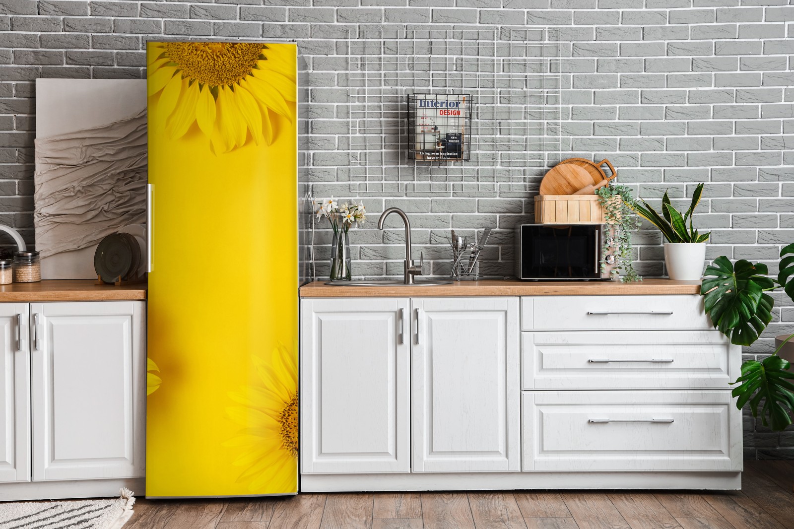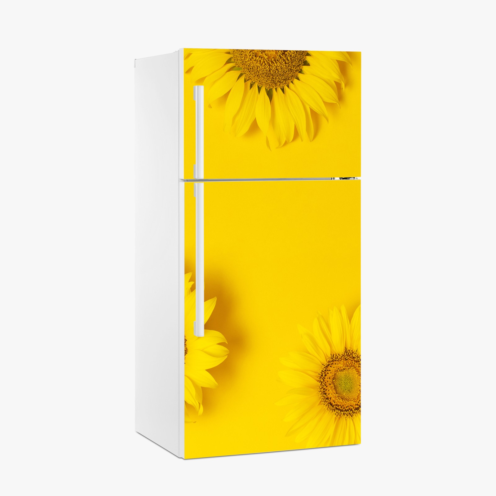 Naklejka na lodówkę Trio słoneczników na żółtym tle