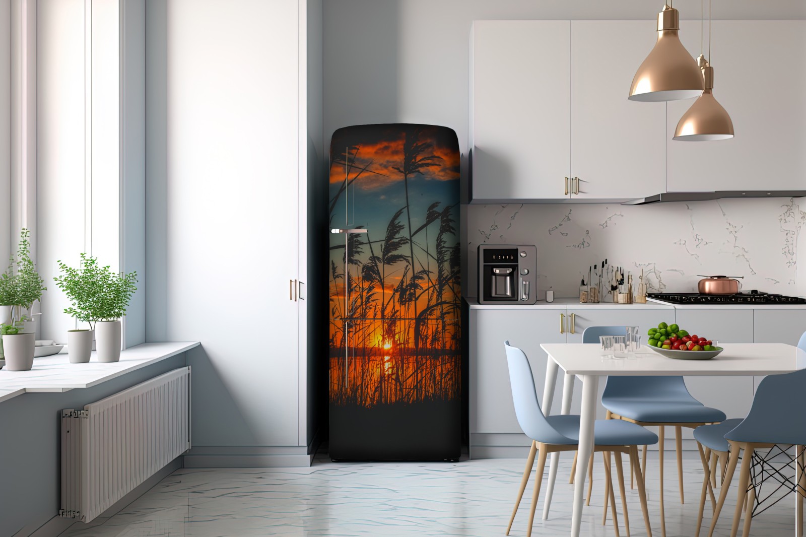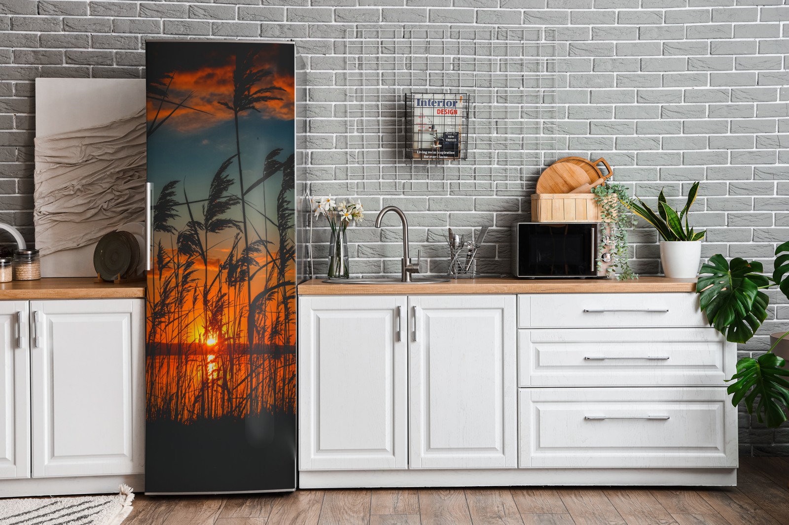 Naklejka na lodówkę Zachód słońca nad jeziorem z sitowiem w sylwecie