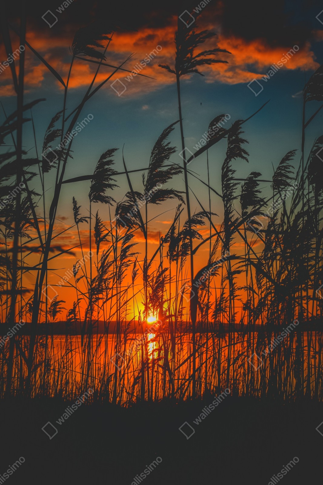 Poczuj ciepły spokój zachodu słońca nad jeziorem z sitowiem w sylwecie, idealny do ocieplenia wnętrza.