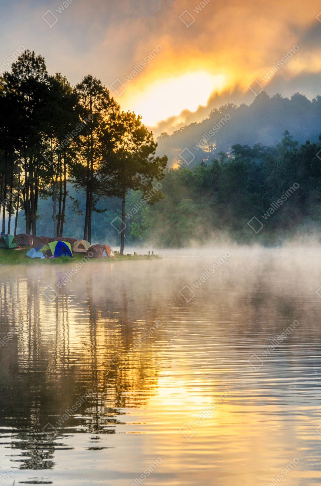 Odkryj spokojny wschód słońca nad mglistym jeziorem z namiotami przy brzegu, idealny do wnętrz inspirowanych naturą.